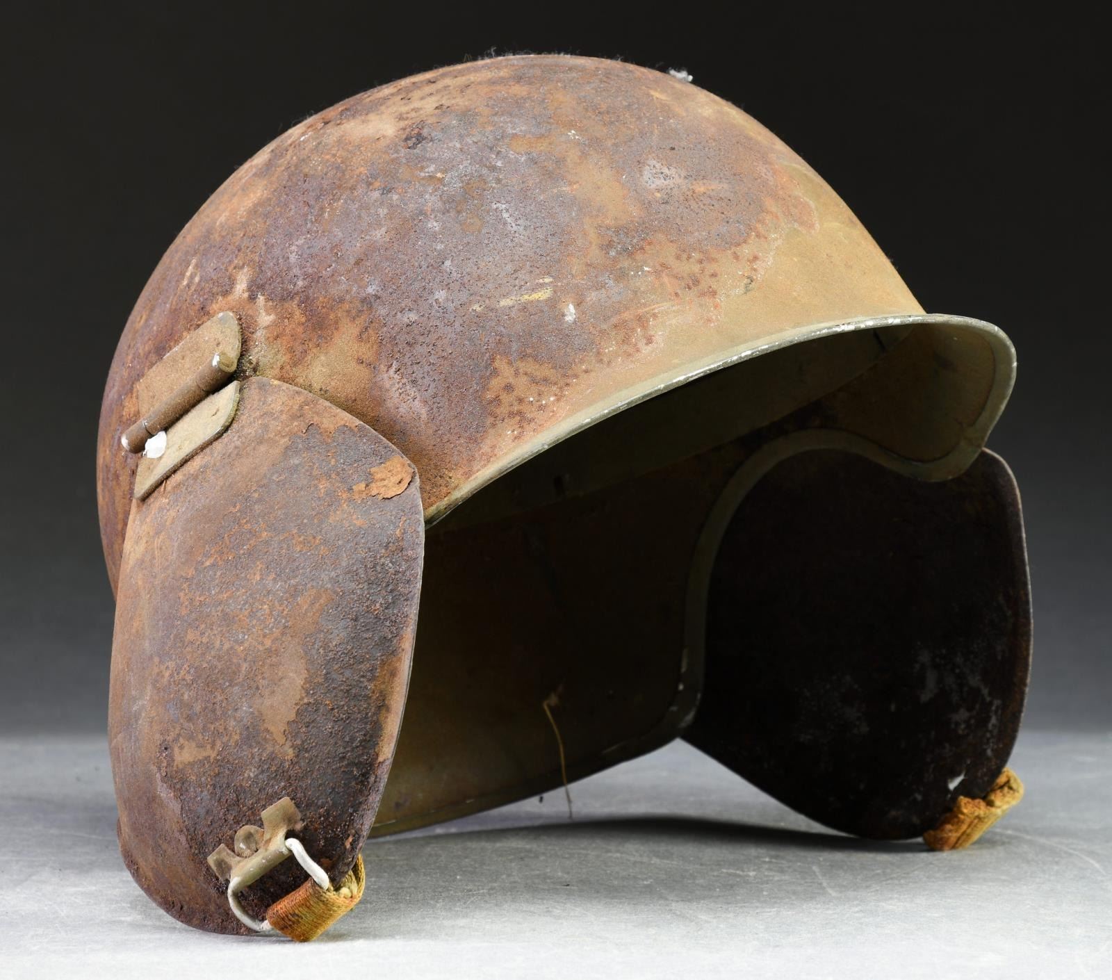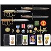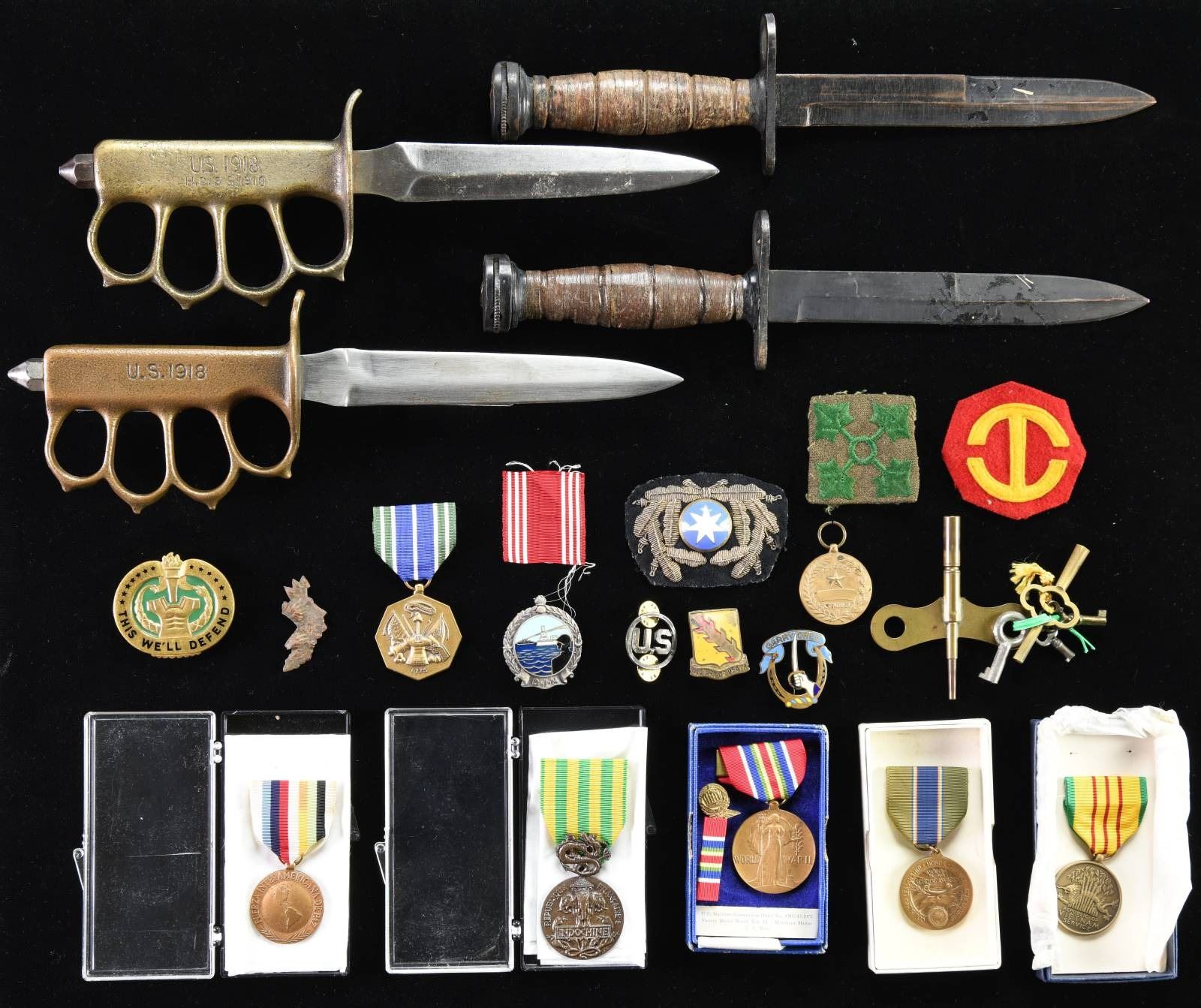This lot consists of 1 US M-3 flak helmet, as used on B17 bombers during WWII with no liner and an oxidized finish. / 2 M-4 style bayonets with no markings. No scabbards. / 1 Rare Henry Disston & Sons M1918 trench knife. This example is original, showing the correct spacing of letters & numbers on the handle. No scabbard. Blade is slightly bent off of center. The hilt shows expected wear. / 1 M1918 US trench knife with no scabbard. It is our opinion this knife is a reproduction, but we encourage collectors to closely examine this piece. / 1 Merchant Marine WWII Victory Medal. / 1 Army Achievement Medal. / 1 Vietnam Service Medal. / 1 American Legion School Award Medal. / 1 Fuerza Interamericana de Paz Merit Medal, awarded in the 1960s to US troops involved in the intervention in the Dominican Republic. / 1 French Indochina Campaign Medal. / 1 French Navy pin. / 1 Cap badge with a blue & white enamel center. / 1 Army Good Conduct Medal with no ribbon. / 1 WWI US 4th Division patch. / 1 Felt yellow & red military patch. / 2 Early enamel DI's. / 5 Keys. / 1 Air Force collar disc. / 1 US Army Drill Sergeant badge. CONDITION: helmet shows significant wear & oxidation. Most other items show light to moderate wear, unless noted above. (02-21042-4/BF). $800-1,200.