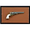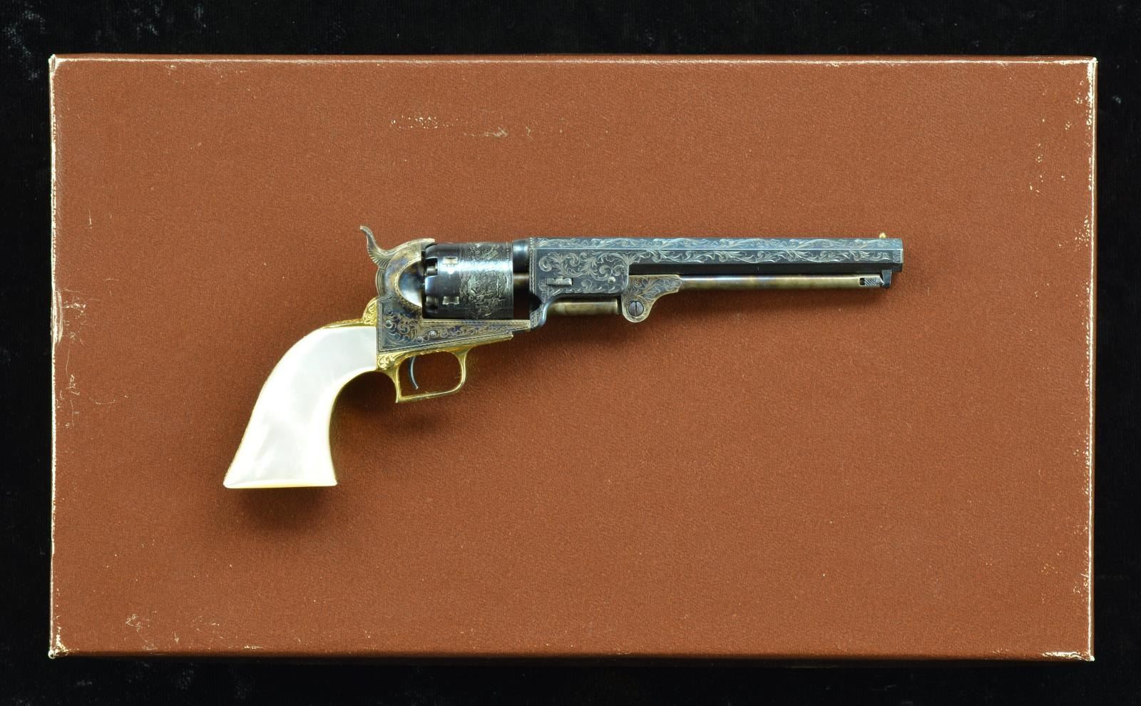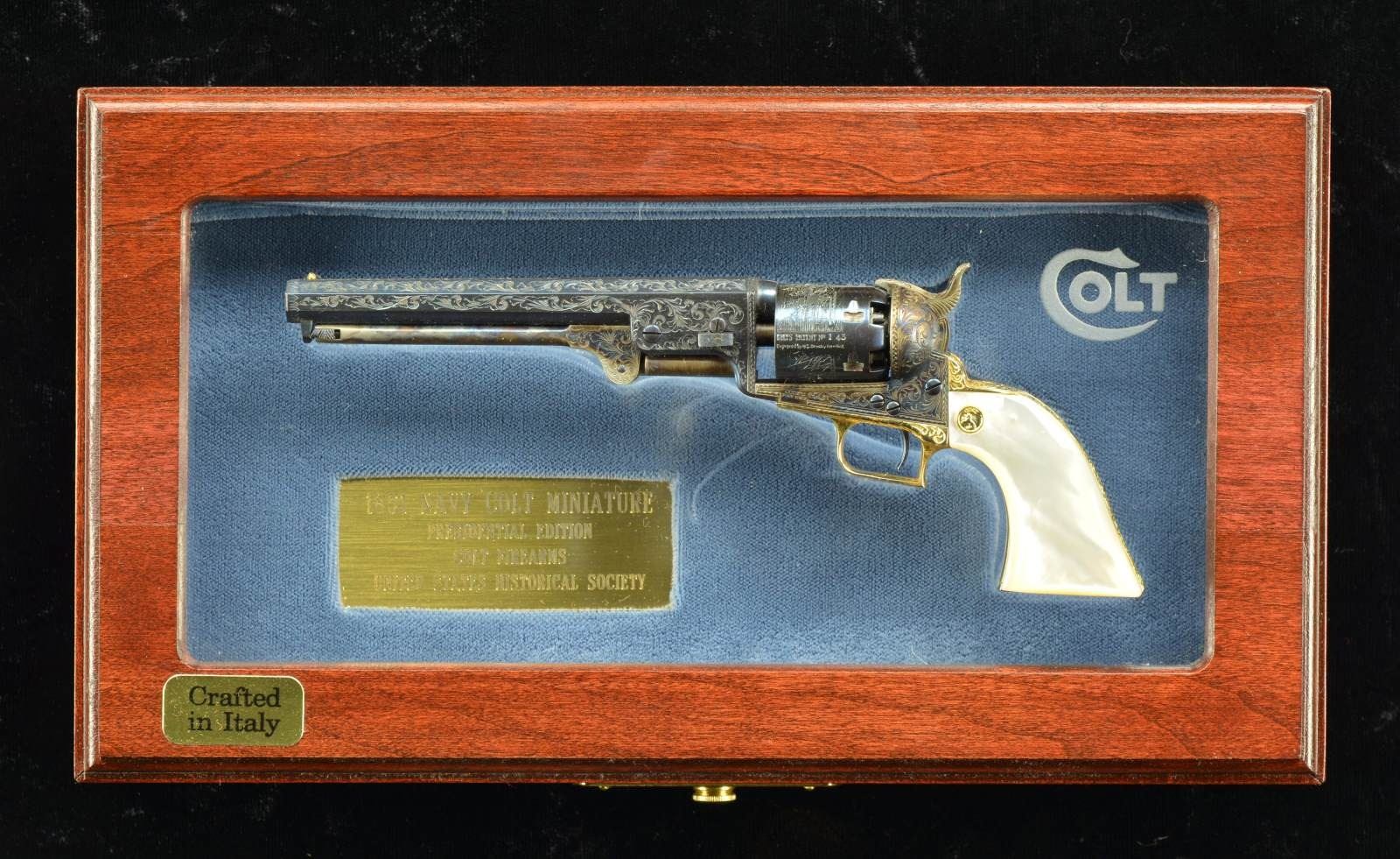 PRESIDENTIAL EDITION MINIATURE 1851 NAVY REVOLVER. S# 143. An exact 1:2.125 scale miniature model, special edition of 1,500 units mfg. 1986. Blue & case hardened finish. Revolver has Custom Shop Traditional Colt engraving. Mother of Pearl grips. UNATTACHED ACCESSORIES: velvet lined Cherry case w/ etched top glass lid & box. Envelope containing Colt Firearms letter, Colt Miniature Collector's Club membership certificate, & Certificate of Authenticity attributed to Kenneth Horn. CONDITION: near NIB. PROVENANCE: Estate Collection of Kenneth Horn (Grandson of JC Higgins). (02-16308/MD). $400-600.