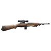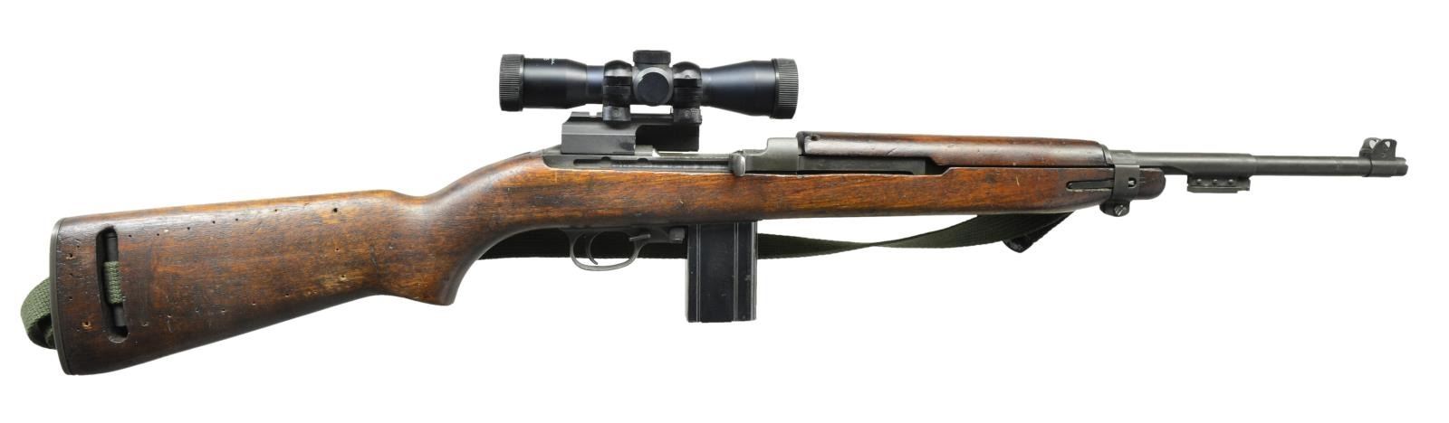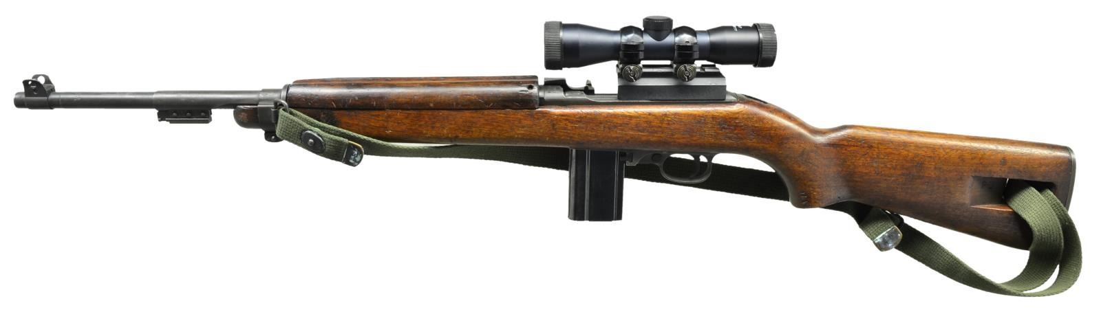 Cal. 30 Carbine. S# 568398. Bbl. 18" marked behind front sight "INLAND MFG. DIV GENERAL MOTORS 7-43". Rear sight has been removed & replaced w/ "no drill & tap" scope mount. Mount has Ultralux 4x25 scope installed. Scope has duplex reticle. Blade front sight w/ protective ears. Sight has been enhanced in white. Bbl. band w/ bayonet lug marked "J.M.Q.". Flat bolt marked "AI". Straight cut slide marked "AOB". Forged trigger housing marked "N. Rotary safety". Mag. catch has extension for 30 rd. mags. Straight cut hammer has encircled "BR". Walnut stock set w/ low wood oval cut buttstock marked "P.U" in sling slot. 2 Rivet handguard marked "IO". UNATTACHED ACCESSORIES: 2 - 15 rd. mags., 2 - 5 rd. mags, & bbl. band w/out bayonet lug marked w/ encircled "A". Green web sling. CONDITION: stock set has moderate wear, staining, dents & scratches. Right side of buttstock has sm. holes from attachment of unknown accessory. Metal has 60% original finish w/ light wear & sm. areas of light oxidation & spots of missing finish. Scope optics appear clear & serviceable. Good shiny bore w/ light wear to lands. (21-2976/RW). CURIO. $600-900.