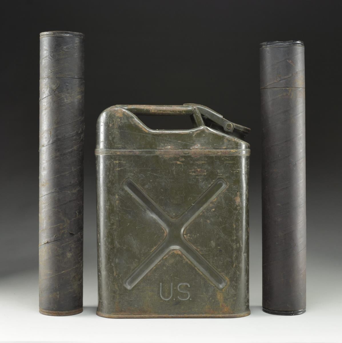 US JERRY CAN & 2 ARTILLERY SHELL CONTAINERS.