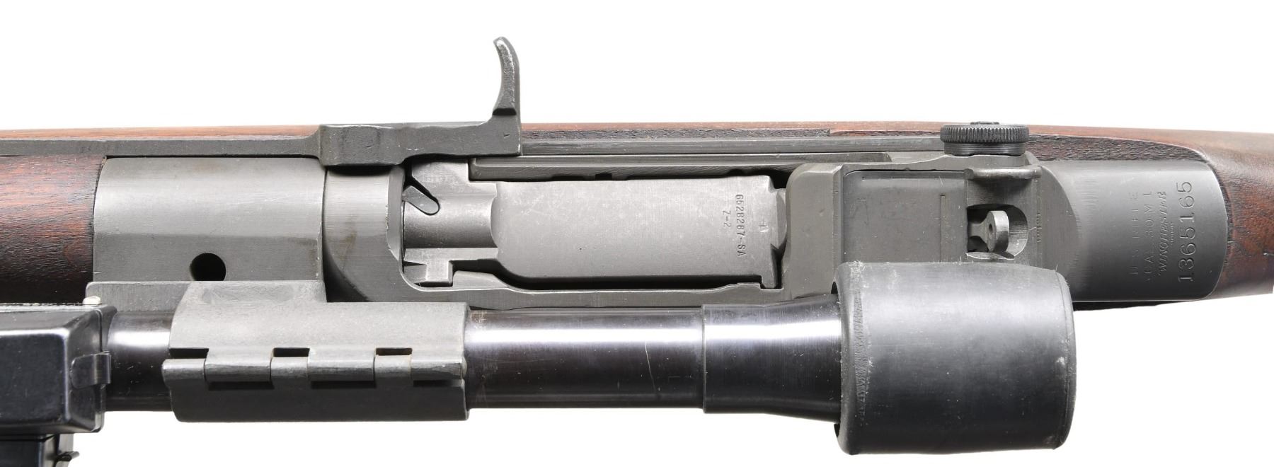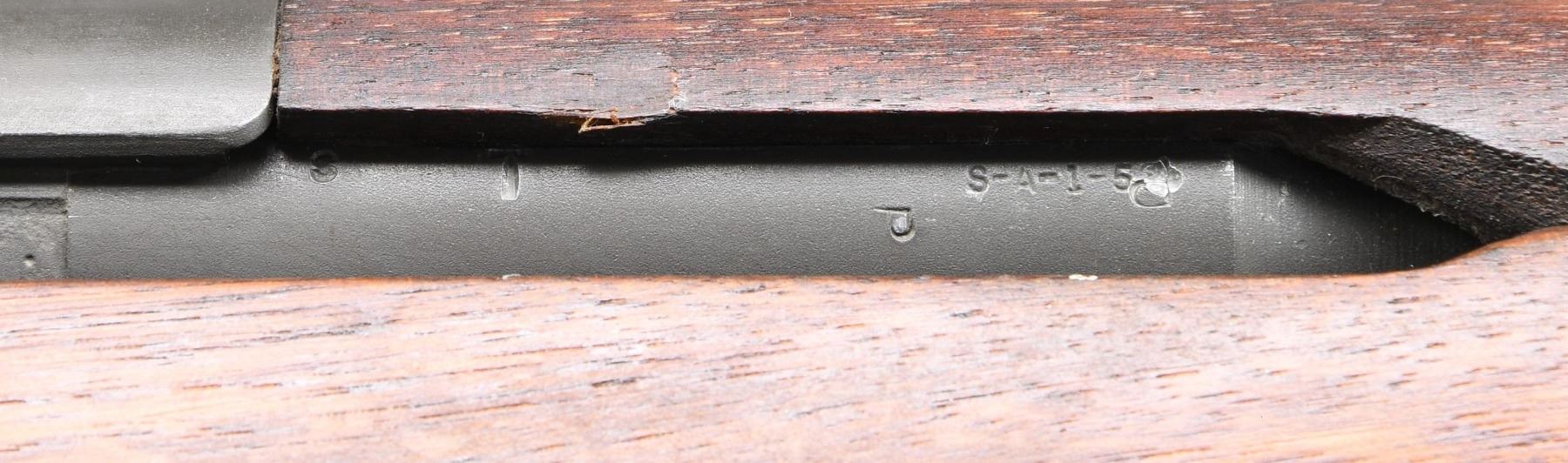 WINCHESTER RECEIVER. Cal.30-06. S#1365165. This M-1D was obtained from the CMP in excellent arsenal rework condition with its correct M84 telescopic sight and the correct basic issue items for this rifle. Bbl. 24". Barrel is marked on the left side "S-A-1-5?". The last digit has been obliterated by a round nosed punch. The throat gauges 1.5. The muzzle gauges 1.0. The receiver and hammer are marked "WRA" with the balance of the parts marked "SA". T105E1 aperture rear sight. Blade front sight with protective ears. The barrel has the correctly fitted base for the M84 scope. Correct short rear handguard. Walnut stock set. Buttstock is marked only with two "P" proofs under grip. The lace-on leather cheek piece is unmarked. The M84 scope is marked on a plate on the right side"TELESCOPE" / "SERIAL NO. 16818". The markings on the packing materials indicate that the scope was overhauled "4/68-SA4". The scope shows very light wear and the optics are sharp and clear. Post and crosshair reticle. UNNATTACHED ACCESSORIES: The paperwork supplied with the rifle includes DD Form 1348-1A in the name of the original purchaser and a bill of sale from the purchaser to another individual. Two copies of the "Basic issue items list from TOOELE ARMY DEPOT, Tooele, Utah. These items accompany the rifle and are in their original sealed packaging. Matching cardboard shipping box. CONDITION: wood and metal retain nearly all of their quality arsenal rework finish making an attractive appearing rifle. There is a scratch at the top of the grip on the left side. Near excellent shiny bore with sharp lands. (24-5005/RW). CURIO. 2,750-3,750.