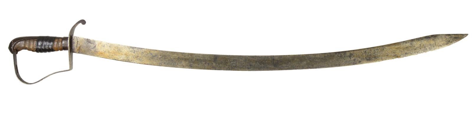 Overall length 38 7/8". Blade length 33 1/2". Plain flat blade stamped at the ricasso "N.STARR". The lack of US inspectors' marks indicates this is likely a state issued saber made under private contract. Iron reverse P hilt with downturned quillon. Leather covered wood grip and no scabbard. CONDITION: blade has a dark gray cleaned mottled patina. Hilt has a dark oxidized patina. Wood grip is 90% complete and held in place by electrical tape. No leather covering remains. (02-18167/BF). $350-500.