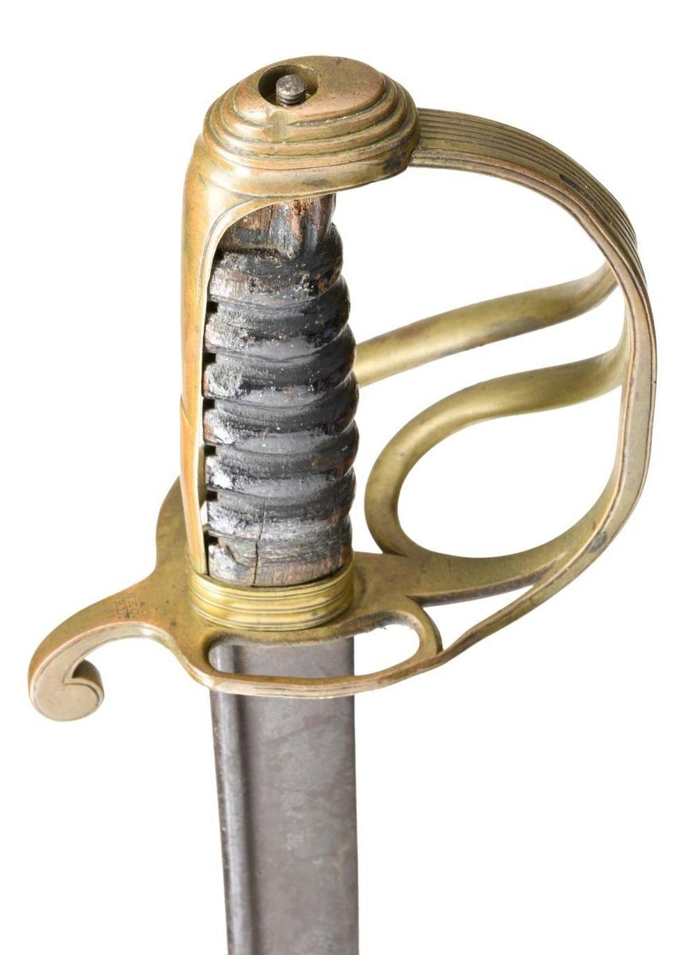 Overall length: 39 1/8”. Blade length: 33 1/2". Plain quillback blade engraved near the hilt “N.P. Ames Cutler Springfield 1837”. Brass hilt with a sharply downturned quillon stamped “WS”. 2-Branch guard joins the knuckle bow past the mid-point and enters the lower section of the stepped pommel. The guard has a thin slot toward the pommel, presumably for a knot. Wood grip. No scabbard. CONDITION: blade has a very dark overall patina. Hilt is quite solid. The spanner nut at the top of the pommel is missing. Grip has no remaining leather with some losses to the wooden core near the pommel. (02-20144/BF). $400-600.