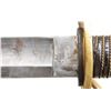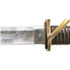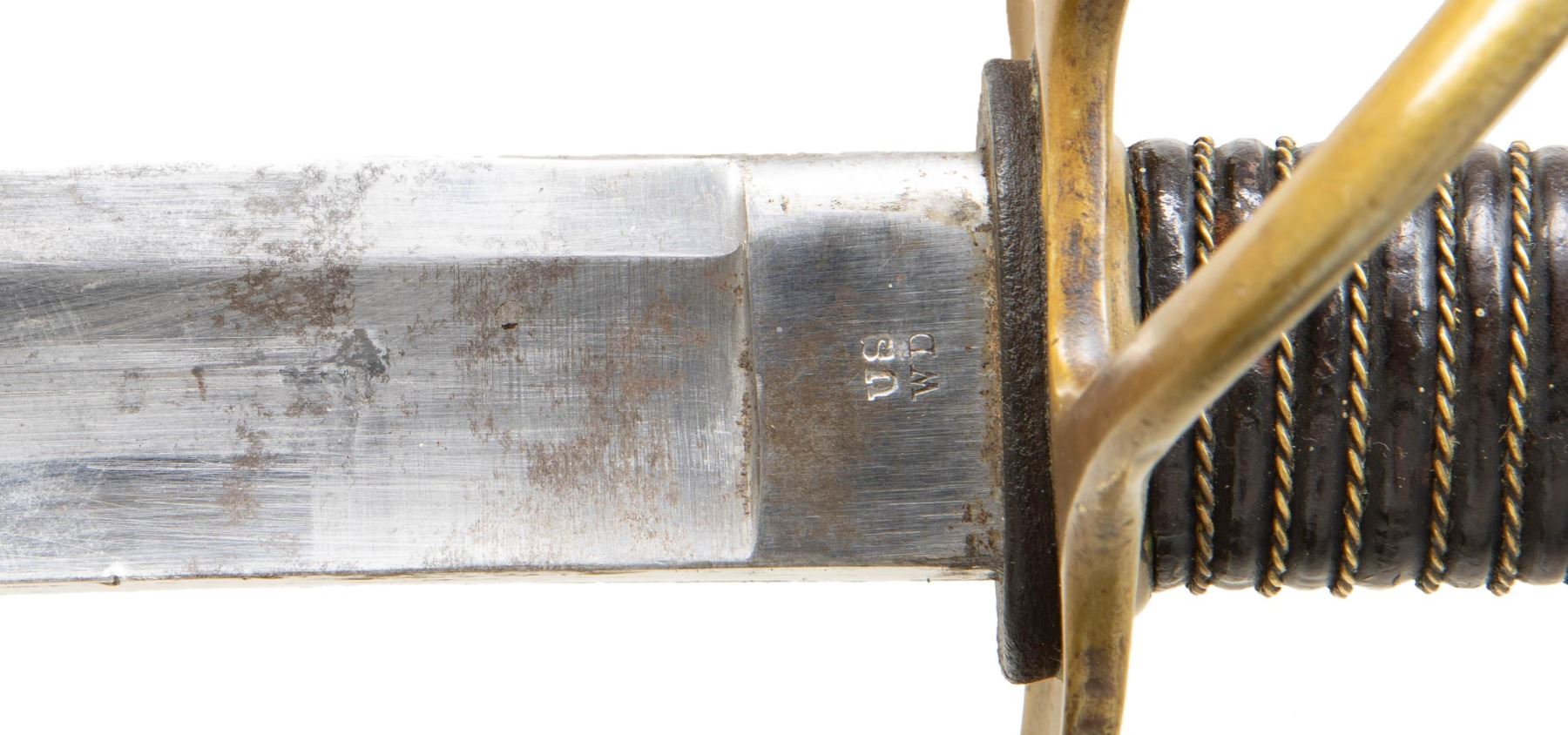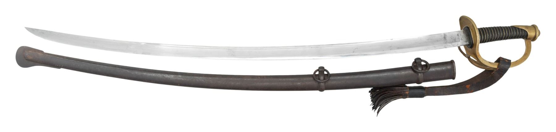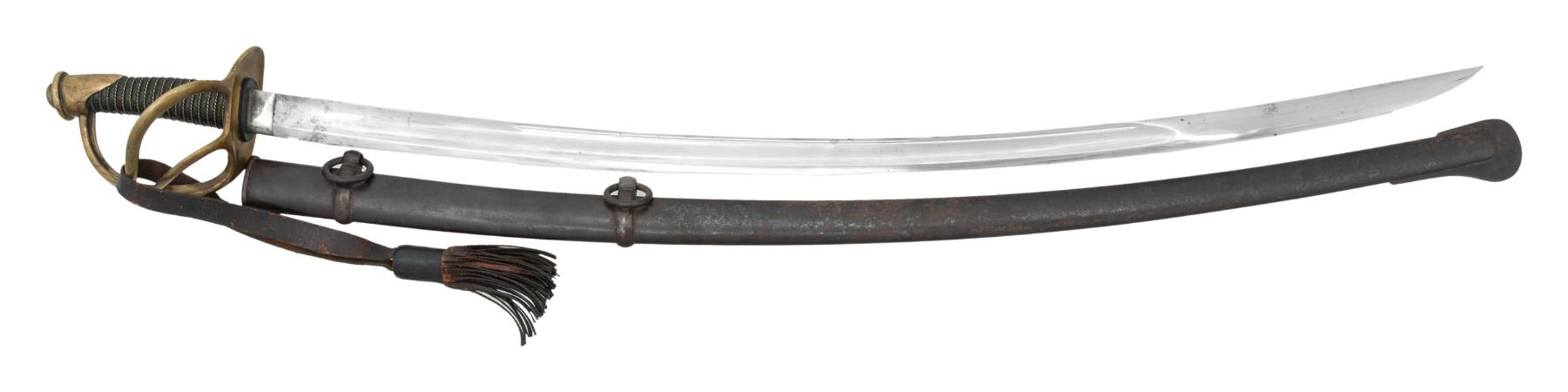 A very nice example of a US M1840 cavalry saber by Ames measuring 43 1/2" overall with a plain 35 7/8" blade featuring a single large fuller and a secondary fuller near the spine. The ricasso is marked "N. P. AMES CABOTVILLE 1848" & "US WD". Brass hilt with standard two branch guard. Wire wrapped leather grip with a non-regulation leather sword knot attached. Iron scabbard with a darkened finish. CONDITION: fine blade with only scattered staining. Hilt is undamaged with a pleasing tarnish. Grip shows light wear and the knot shows moderate wear. Scabbard has an oxidised finish but no notable dents. PROVENANCE: Estate Collection of John "Jack" Dhooghe. (02-25558/BF). NON-GUN. $500-700.