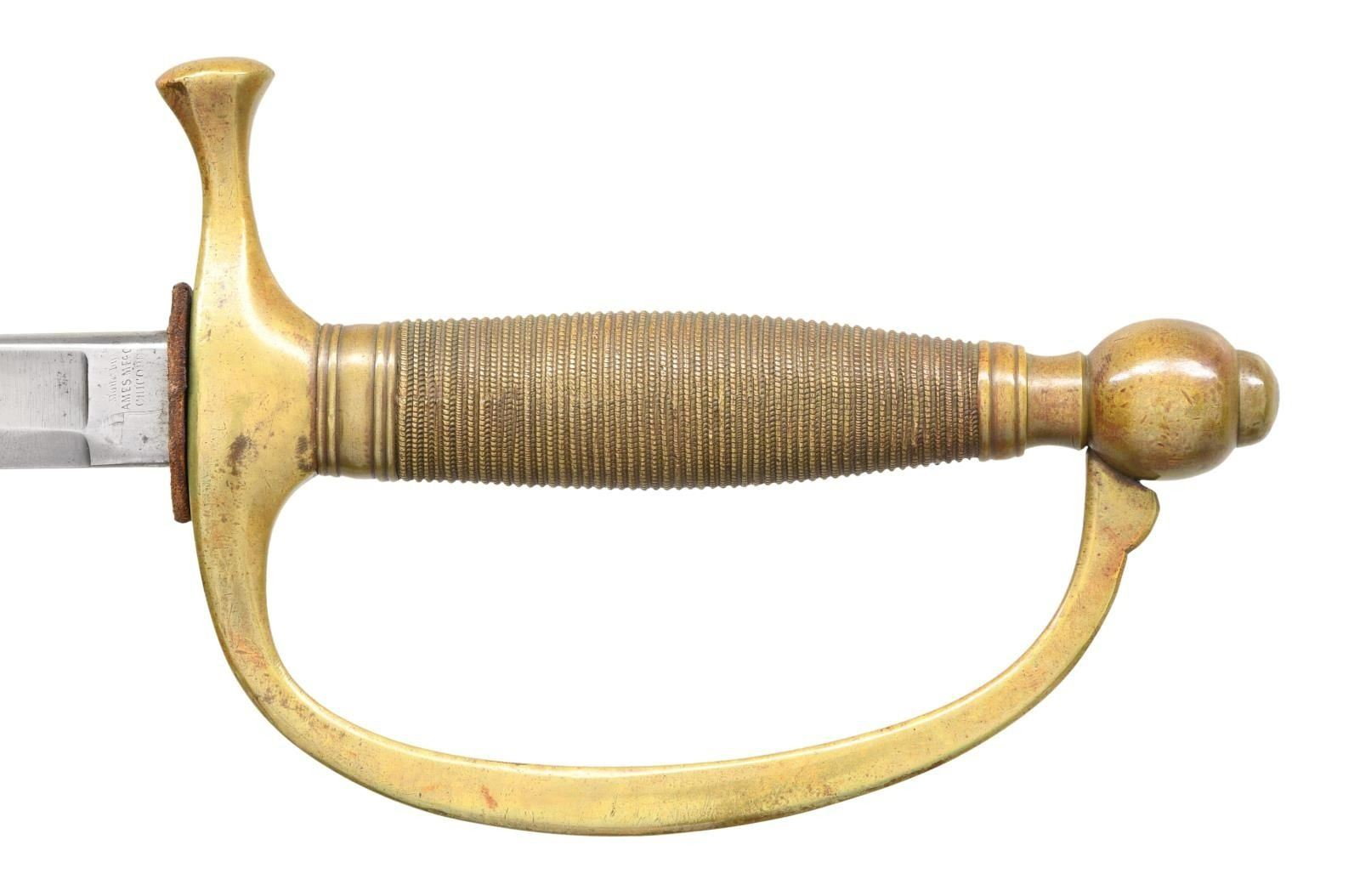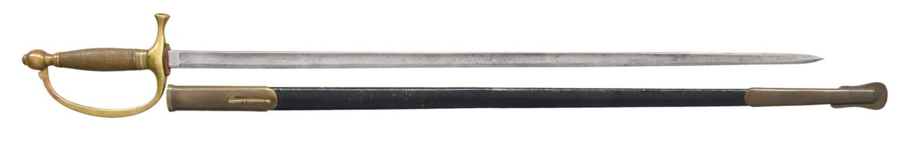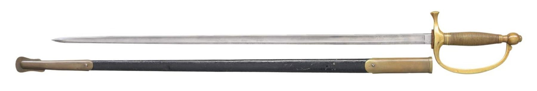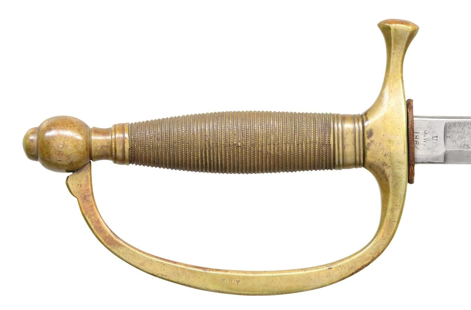 Overall length: 37 1/2". Blade length: 28”. Plain blade with a single medium fuller. Blade is marked on the ricasso “Made by AMES MFG CO CHICOPEE (MASS)” & “US G.W.C 1864”. Brass hilt with a brass-simulated wire-wrapped grip. Improper brass-mounted metal scabbard made by Emerson & Silver. CONDITION: blade has a medium to light gray patina. Hilt has a light mustard patina. Scabbard mounts have a darker mustard patina, and the body has been repainted at some point in time. PROVENANCE: from the lifelong collection of Robert "Mike" Bricker. (02-22330/BF). $250-400.