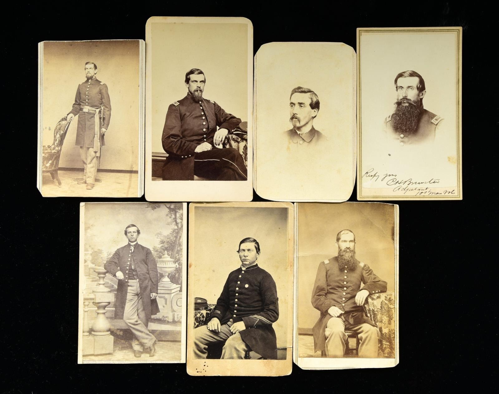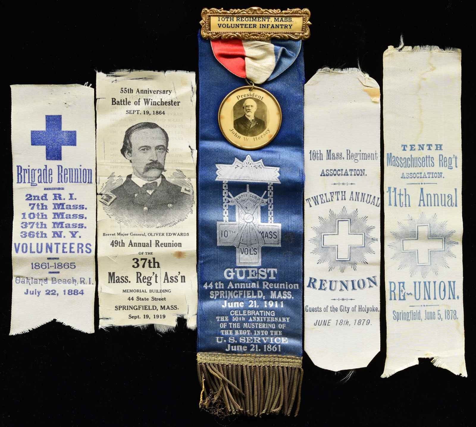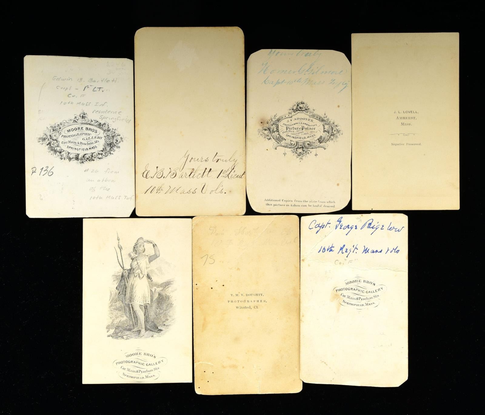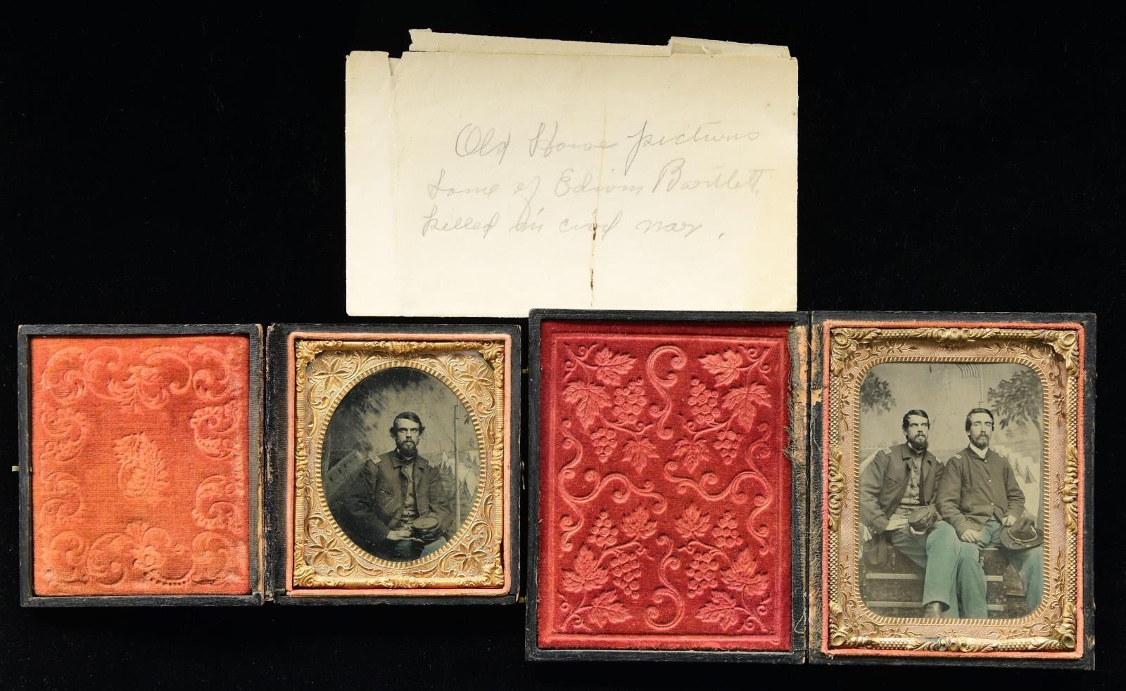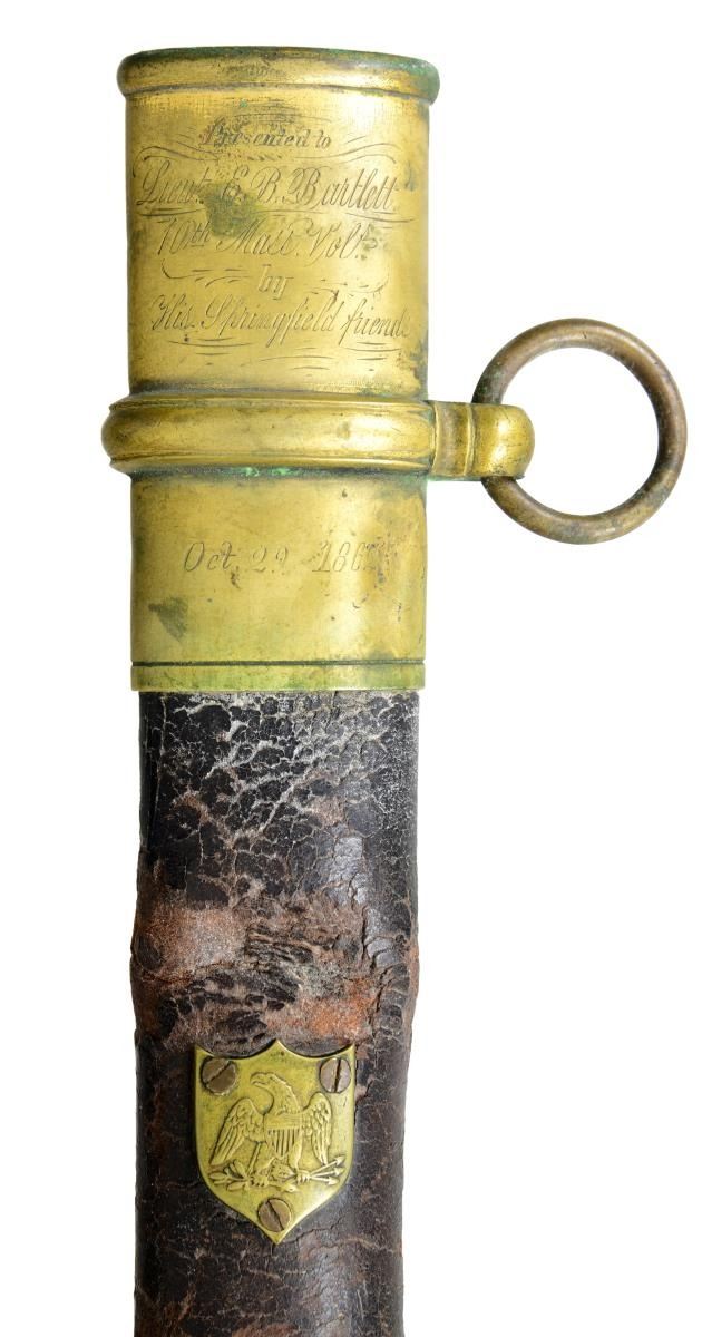 EDWIN B. BARTLETT, WHO WAS KILLED IN ACTION AT SPOTSYLVANIA ON MAY 18, 1864, WITH ASSOCIATED ARCHIVE. This extremely historic and well-fought officer’s sword was carried by Lt. Edwin Bartlett of the 10th Massachusetts Infantry from late October in 1862 until he was killed at Spotsylvania in the spring of 1864. The sword is accompanied by several photographs of Bartlett, along with documents associated with his service, and his obituary, believed to be written by his sister. The sword has an overall length of 37” with a blade length of 30 1/2". The blade has a single wide fuller with a secondary fuller near the spine. The blade is etched over the first 18” with various foliate, military, and patriotic motifs, including a large “U.S.” and a spread-wing American eagle. There is an etched mark near the ricasso that reads “Ames Mfg Co Chicopee Mass”. Gilded brass hilt with pierced foliate-decorated guard, four-lobed knuckle bow, and acanthus leaf and flower decorated pommel with a stepped cap. Wire-wrapped sharkskin grip. Scabbard is gilded brass-mounted leather with a brass eagle in shield mounted between the top two mounts. The top mount is engraved “Presented to Lieut. E.B. Bartlett 10th Mass. Vols. by His Springfield friends. Oct. 29. 1862”. Images in this historic group include a ¼ plate image of a seated Edwin Bartlett with his friend Edwin Whitney. Bartlett is in a frock coat with light blue-tinted trousers, and his kepi on his lap. Whitney is in an officer’s 4-button sack coat with light blue-tinted trousers, and a slouch hat with corps badge on the side. A second hard image is a 1/6 plate showing Bartlett seated wearing a frock coat and uniform vest with a kepi on his lap. There are two CDVs of Bartlett; one shows him standing in a 9-button frock with a belt, sash, and the above sword at his side; the other image shows Bartlett seated in a frock coat with dress trousers and his kepi sitting on a table. Other CDV images include a seated Private Davis Hart wearing an ID disc and kepi on a table. Hart was also killed at Spotsylvania in May of 1864. A seated view of Capt. George W. Bigelow, who was wounded at Spotsylvania. A standing view of Andrew Huntington in a 9-button frock. A mid-chest-up view of C.H. Brewster, Adjutant of the 10th Massachusetts. A bust view of Capt. Homer Gilmore, who was also wounded at Spotsylvania. Other notable items in this archive are the letter presenting him with his sword signed by his “Springfield friends”, orders written to Bartlett, an oval albumen photo of Hosea C. Lombard of the 10th Massachusetts, Bartlett’s enlistment document as a Seargent Major, Bartlett’s handwritten obituary, and a leave of absence granted to Bartlett in January of 1864. Several reunion ribbons for the 10th Massachusetts are included with this lot. UNATTACHED ACCESSORIES: there are three large binders containing a wealth of information about Bartlett, as well as the brave soldiers that served with him, many of whom were killed alongside Bartlett at Spotsylvania. The binders also include a detailed history of the 10th Massachusetts, their leaders, and their battles. Much of the information pertains to the Battle of Spotsylvania, where so many of the brave 10th fell. Untold hours of research went into assembling this extraordinary plethora of information. There is also an envelope containing copies of Bartlett’s service record throughout the war. Also included is a book titled “The 10th Regiment Massachusetts Volunteers” published in 1909 at Springfield, MA. A book titled “When This Cruel War is Over: The Civil War Letters of Charles Harvey Brewster” by David Blight is also included. A custom-made wooden display case for the sword and likely the images. CONDITION: blade has a medium gray patina with very minor staining. The hilt shows traces of original gilded finish. The grip is quite worn and dry with a separation at the seam. The wire is complete but dislodged in places. The scabbard shows flexing and flaking to the leather body, and is broken and detached at the drag, though all pieces are present. The drag shows several dents. The inscription remains quite clear and easily read. Hard images remain quite clear but have some craquelure apparent. CDVs show some slight staining but are generally undamaged. Documents show fading but remain legible. Ribbons are quite solid. The 10th Massachusetts was a very hard-fought regiment, and this sword shows the rigors of two years of difficult campaigns in indescribable conditions. Edwin Bartlett was there for every battle, every march, and every camp until he fell at Spotsylvania in 1864. (02-21307/BF). $7,000-10,000.