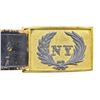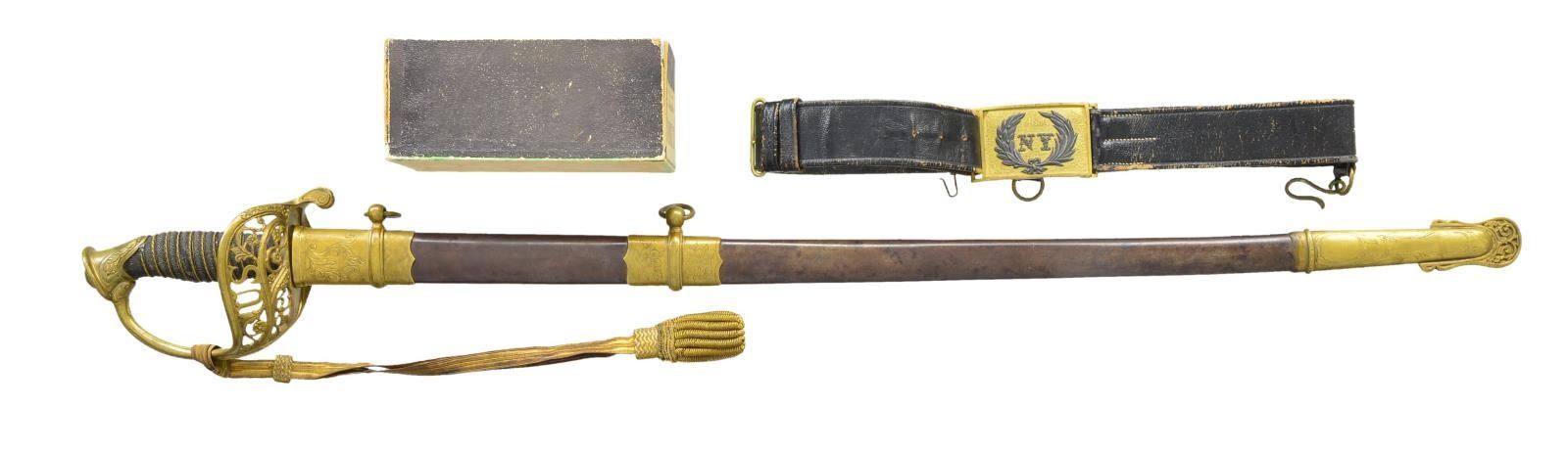 This fine grouping features a M1850 Staff & Field Officer’s sword measuring 38 1/2" overall with a 30” blade. The blade is etched over 2/3 of its length with various military, patriotic & foliate motifs. The spine of the blade near the ricasso is etched “IRON PROOF”. Gilded brass hilt featuring an elaborate semi-basket guard with cutout foliate motifs & large “US”. Laurel leaf embellished pommel with officer’s gold gilded sword knot attached to the knuckle bow. Wire wrapped sharkskin grip. Gilded brass mounted iron scabbard. Mounts are etched with foliate & floral motifs. The belt is a high-grade pre-war New York Staff Officer’s belt featuring a heavily gilded sword belt plate with an applied silver wreath surrounding the letters “NY”. Both the buckle & keeper are stamped “18”. The belt has no sword straps but the suspension loops are present. The belt is housed in its original box with a label that reads “N.Y. Regulation SWORD BELTS”. The name “I.W. Ainsworth” is written at the top of the label in period ink. Ira Ainsworth was born in Vermont in the year 1814. He was, by profession, a wholesale grocer and later became the Colonel of the 10th New York State Militia. His fine belt & sword were likely purchased when he became Colonel of the 10th as they reflect pre-Civil War quality and manufacture. The 10th was mustered into volunteer service in the Civil War as the 177th New York Infantry late in 1862. At this time, Ainsworth was appointed its Colonel. The regiment served in the 3rd Brigade of General Sherman’s division in the Department of the Gulf. UNATTACHED ACCESSORIES: a page with information on Colonel Ainsworth and two modern copies of photographs of the Colonel. CONDITION: the blade exhibits areas of original factory polish. The hilt is undamaged and retains much original gilding. The grip shows light wear and is 98% complete. The knot shows light wear. Scabbard mounts retain traces of original gilding mixed with a wonderful mellow mustard patina. The scabbard body has just a couple of very minor shallow dents. The belt shows light overall wear and remains quite strong. The buckle is absolutely stunning. The box shows moderate wear and has no lid. (02-19360/BF). $3,500-4,200.