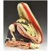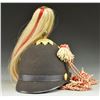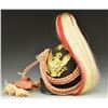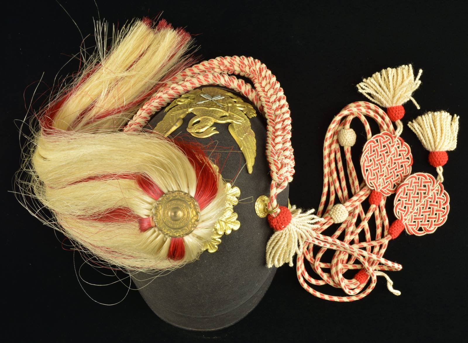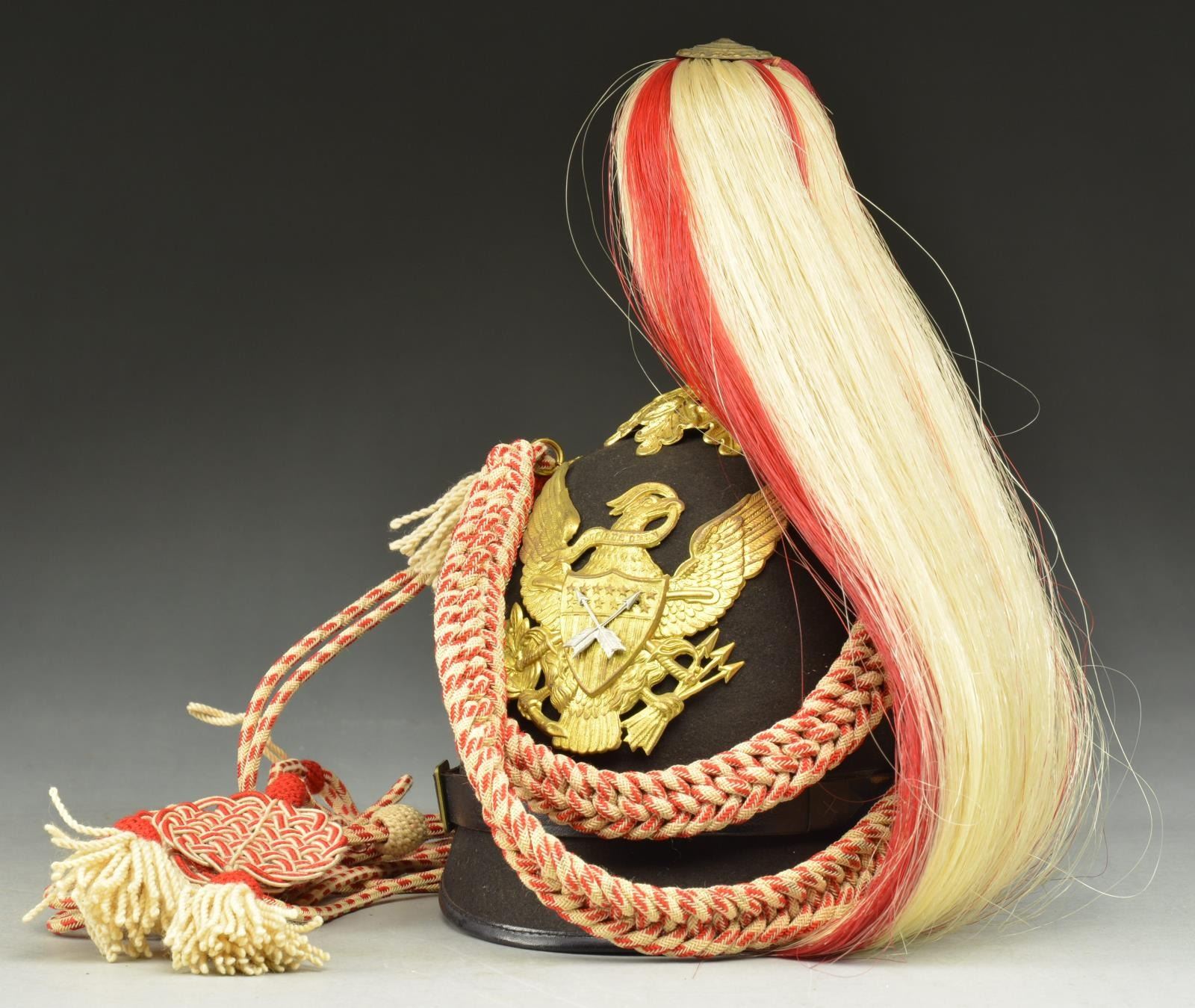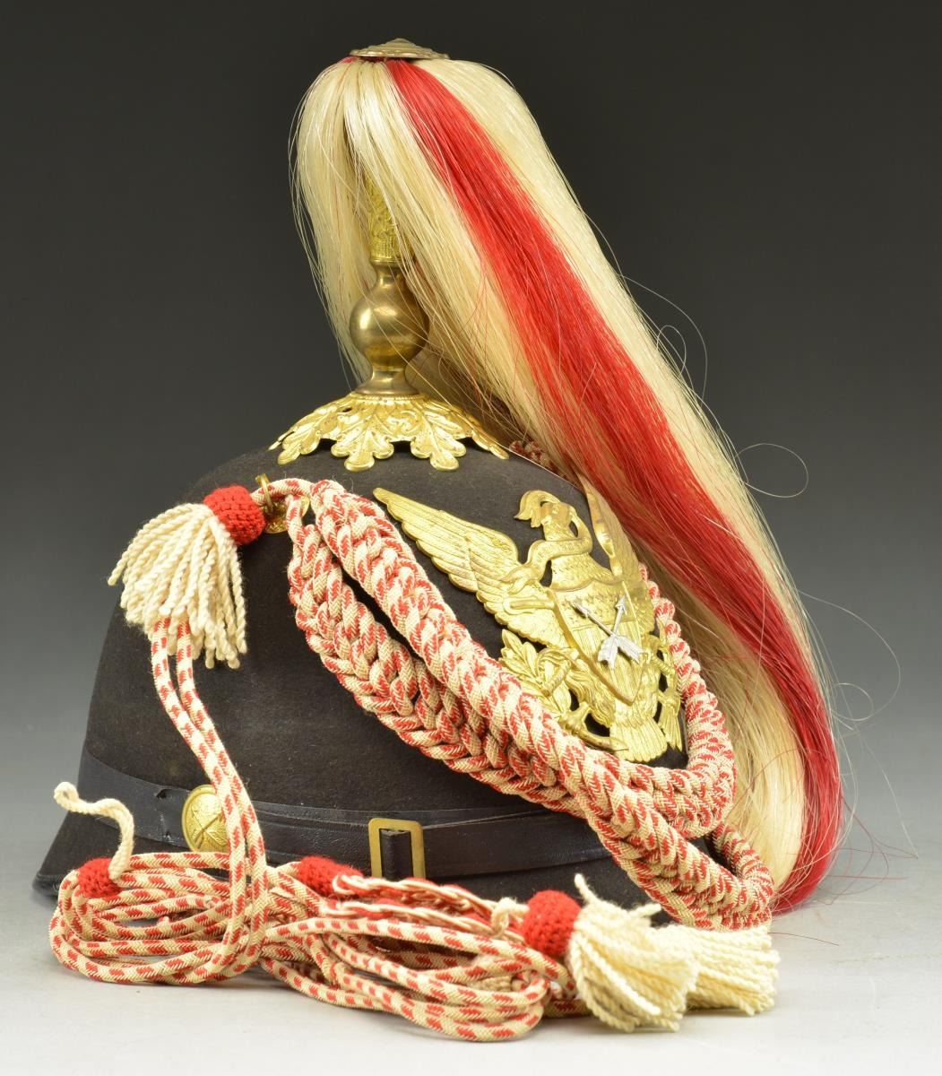 This helmet has a 1 piece body with an interior tag that reads “RAYMOLD & WHITLOCK MILITARY Contract, June 4, 1883 GOODS 39 West 14th St., N. Y.”. The helmet features a cavalry front plate with silver crossed arrows added to the shield. Side buttons also show crossed arrows. The long plume and the aiguilette are red & white as is correct for an Indian Scout. CONDITION: helmet body seems quite solid. Aiguilette & plume are slightly soiled. Plume holder has varying degrees of patina. PROVENANCE: From the Raymond Darida Estate. (02-18035-1/BF). $900-1,200.