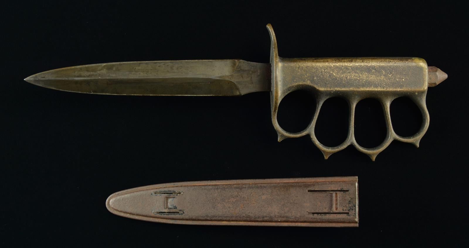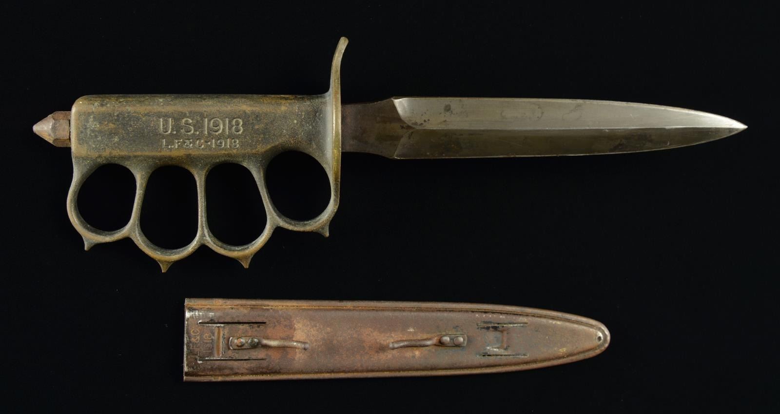 Overall length: 12 1/4". Blade length: 6 3/4". A fine WWI era trench knife by Landers, Frary & Clark w/ a dbl. edged spear point blade & showing a darkened finish. Solid brass hilt w/ built in knuckle duster. Grip is marked, “U.S. 1918 L.F & C - 1918”. Skull crusher nut on pommel. Iron scabbard w/ both hooks intact. CONDITION: blade has significant blued finish remaining. Hilt has a dark mustard patina. Pommel nut & scabbard show a general oxidized finish. (02-16318/BF). $700-1,000.
