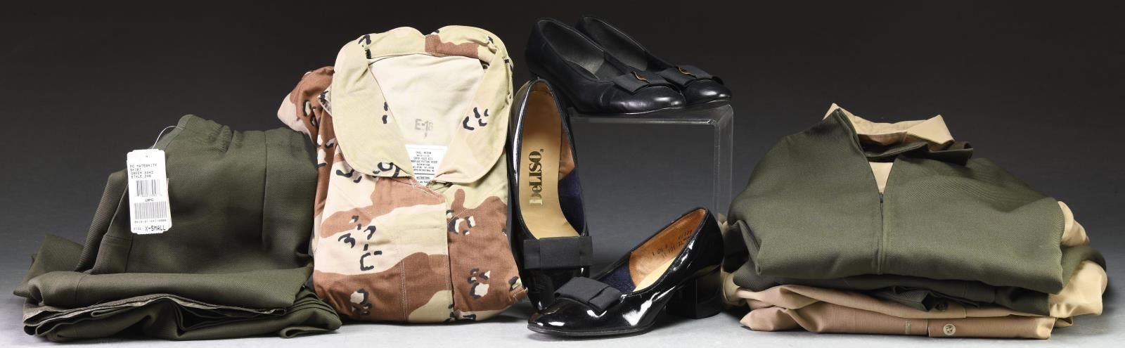 This group consists of uniforms for a female Marine with the rank of Lance Corporal. Items include 4 khaki uniform blouses. / 1 Olive green maternity top. / 2 Pair of black Mary Jane pumps. / 2 Maternity skirts. / 1 Pair of maternity pants. / 1 Tie. / 1 Body armor cover in desert camouflage. CONDITION: all uniforms are like new or very lightly used. (02-21077/BF). $50-150.