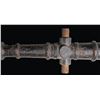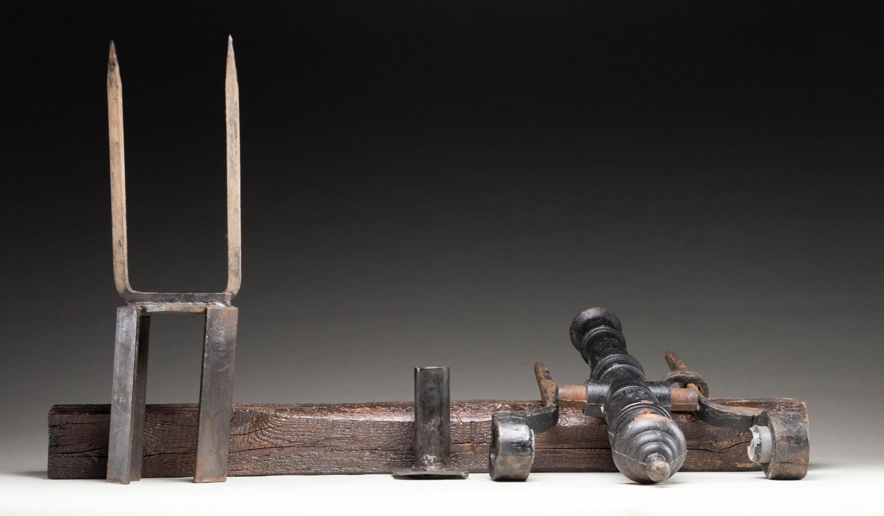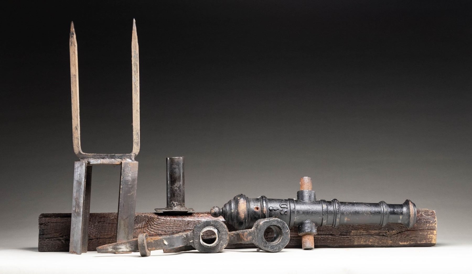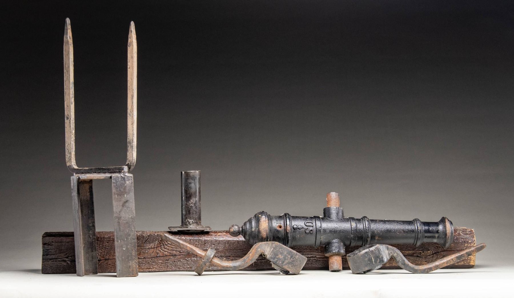 Cast iron cannon made by Manitowoc grey Foundry of Wisconsin. Top of cannon is marked "US" with flaming bomb emblem. Cannon measures about 21" in length & muzzle is about 1" in diameter. Partial mount an old 41" tall piece of wood are included. CONDITION: wood shows scattered cracking & chipping from years. Cannon shows scattered cracking on mount, pitting, oxidation, flaking paint & edge related wear. Oxidized smoothbore. PROVENANCE: From the Buckstix Collection. (02-26025/MJC). NON-GUN. $1,500-2,500.
