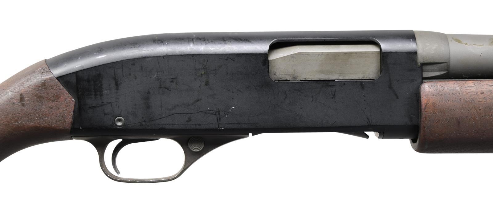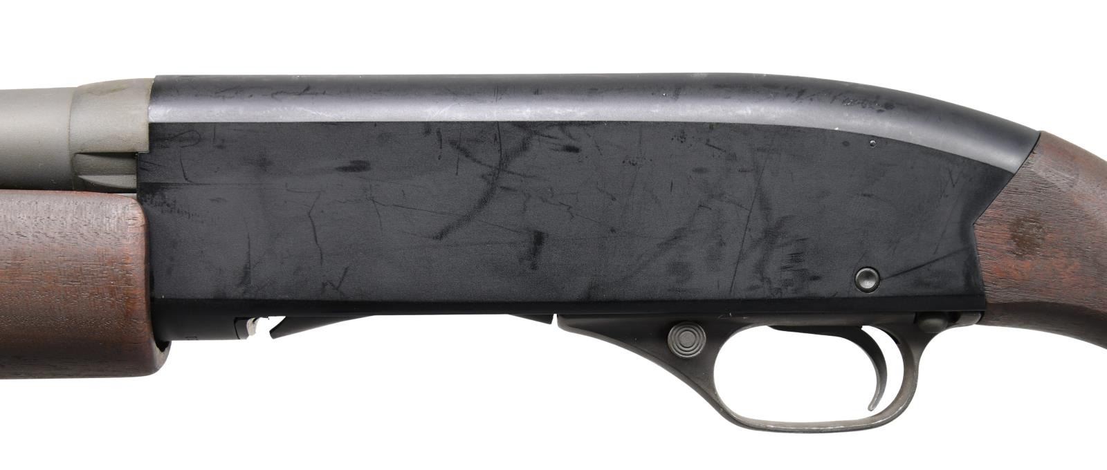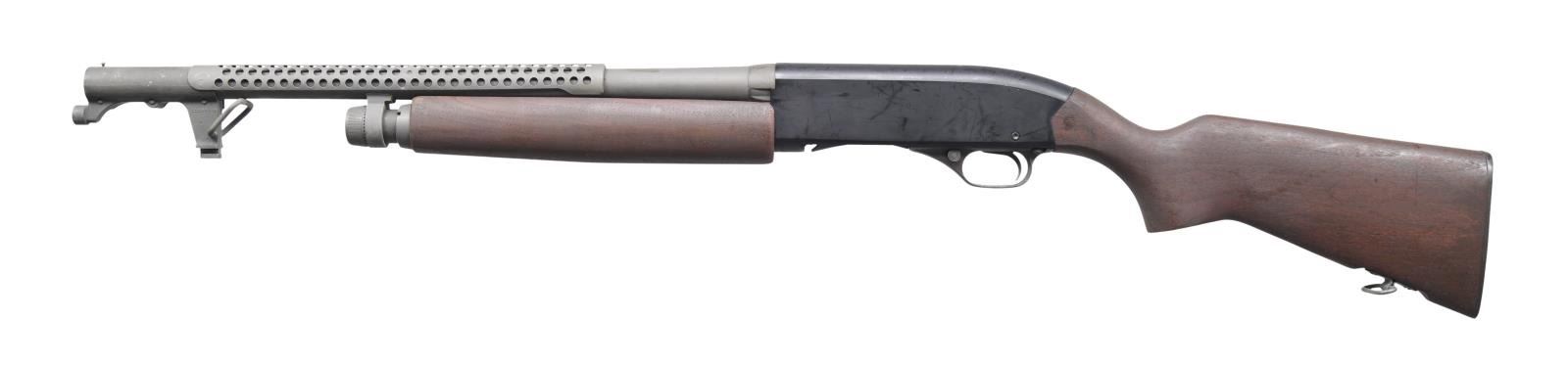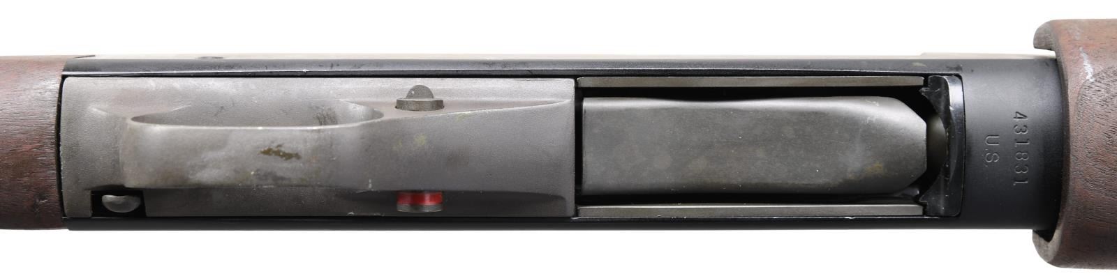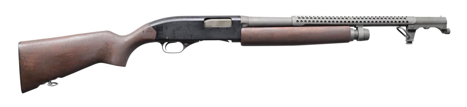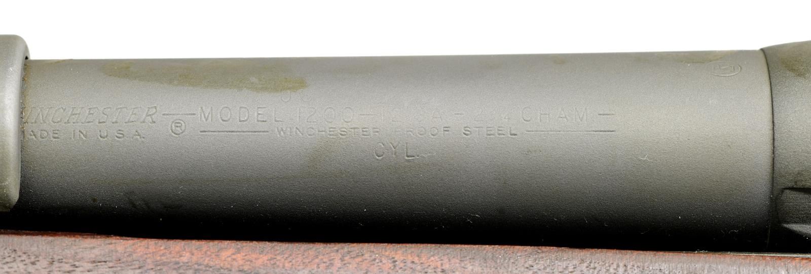 Cal. 12 ga., 2 3/4". S# 431831. Bbl. 20" cyl. bore. In 1965, Winchester developed military versions of the Model 1200 and Model 1400 shotguns. The 1200 trench gun was tested and approved by the U.S. Army, and production contracts were given to Winchester. The model 1200 trench gun is one of the scarcest military trench guns and saw service as recently as 2006 in Iraq and Afghanistan. Matte blue-black finished alloy receiver. The bottom of the receiver below S# is stamped "U.S.". Bbl. is fitted with a hand guard and bayonet lug. The left side of the bayonet lug is marked with part number 11688389/m. Bbl. & hand guard have a parkerized finish. The left side of the bbl. is stamped "U.S." above standard Winchester bbl. markings and the "CYL" choke marking. The walnut beavertail forearm and pistol grip stock with the original plastic buttplate have a dull military finish. The toeline of the stock has a screw-attached sling swivel. CONDITION: near excellent, retaining 97% metal finish, showing only light scratches and handling marks. Wood shows small dents and marks. Bright, near-excellent bore. (23-5532/DS). MODERN. $4,000-6,000.