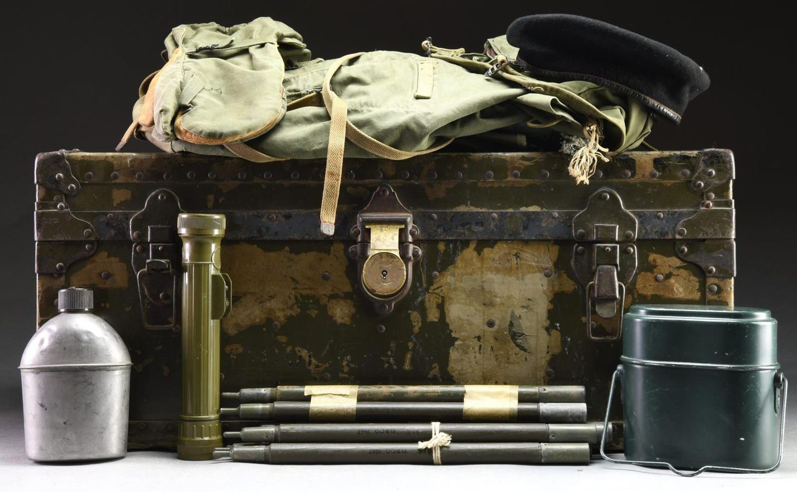 This varied group includes 1 pair of leather & OD cotton cold weather mittens. / 1 Military issue chemical heat pad. / 1 Detachable hood for an M1943 field jacket, dated 1944. / 1 Sage green nylon protective helmet bag. / 1 OD cotton canvas backpack marked “LAIRD SCHOBER 1944”. / 3 Sets of 3 collapsible tent poles. / 1 Army flashlight. / 1 Web nylon pistol belt. / 1 OD equipment pouch. / 1 Chemical carrying pouch. / 1 Black beret. / 2 Khaki overseas caps. / 1 Nylon storage bag. / 1 Rubberized OD storage bag. / 1 Pair of puttees. / 1 Leather guidon carrier. / 1 Leather rifle sling. / 1 OD cotton canvas carrying bag. / 6 Various military straps for web gear. / 1 OD mess kit, stamped “PSL”. / 1 Metal canteen with screw top, marked “US 1944”. CONDITION: items generally show light to moderate wear & appear functional. (02-19664/BF). $100-300.