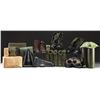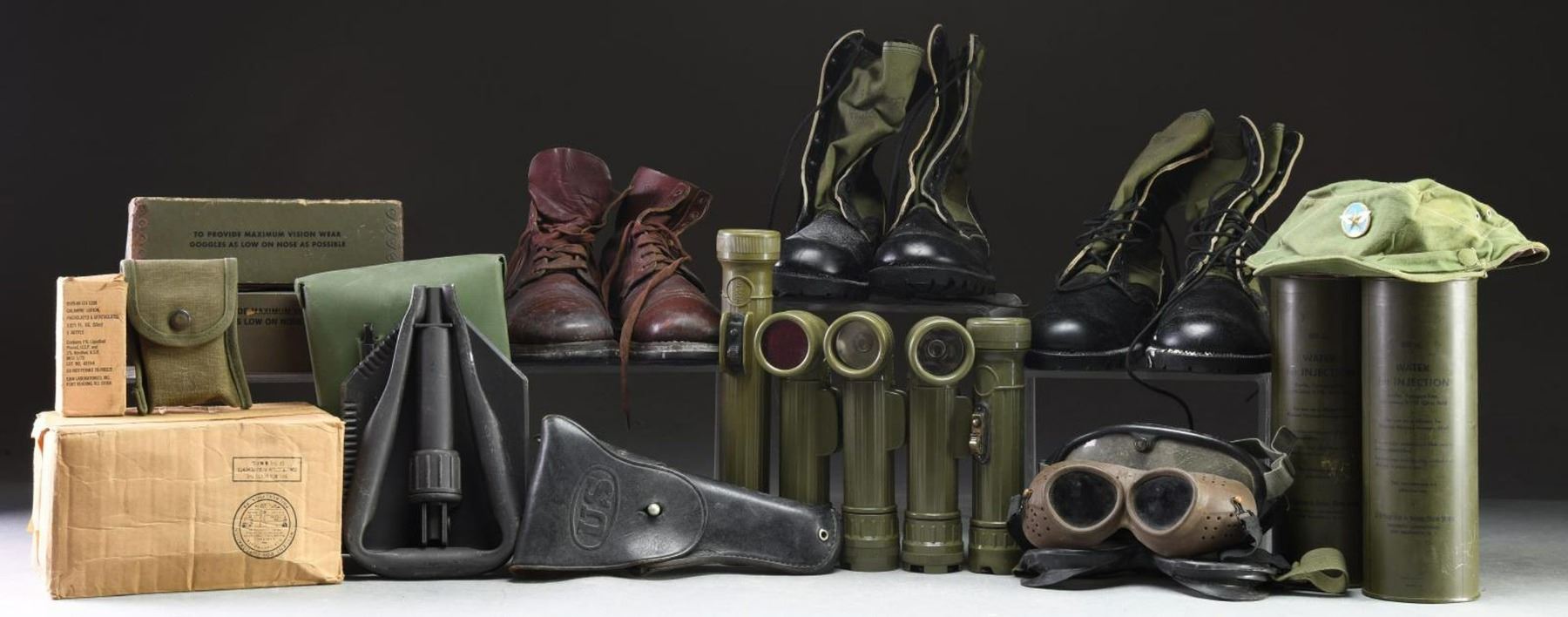 This lot contains 2 pairs of Vietnam issue black leather & OD nylon boots. / 1 Pair of WWII era brown leather boots. / 2 Cans water for injection by E.R. Squibb & Sons of New York. / 2 Pairs of sun, wind, & dust goggles in original box. / 1 Unopened box containing a B7 type life preserver. / 2 OD cotton canvas pistol belts. / 2 M14 ammo pouches. / 1 OD nylon pistol belt. / 3 Pairs of goggles. / 1 Flash suppressor in pouch. / 1 Magnetic compass in OD pouch. / 5 OD military flashlights. / 1 Original box containing a bottle of calamine lotion. / 1 Packaged first aid dressing. / 1 Khaki cotton canvas bandoleer with 6 pockets. / 1 NVA Air Force cap. / 1 Black holster for a .45 automatic. / 1 Entrenching tool in a rubber carrying case. / 1 Red dickie. / 1 Blue dickie. CONDITION: all items show light to moderate wear. (02-20929/BF). $300-500.