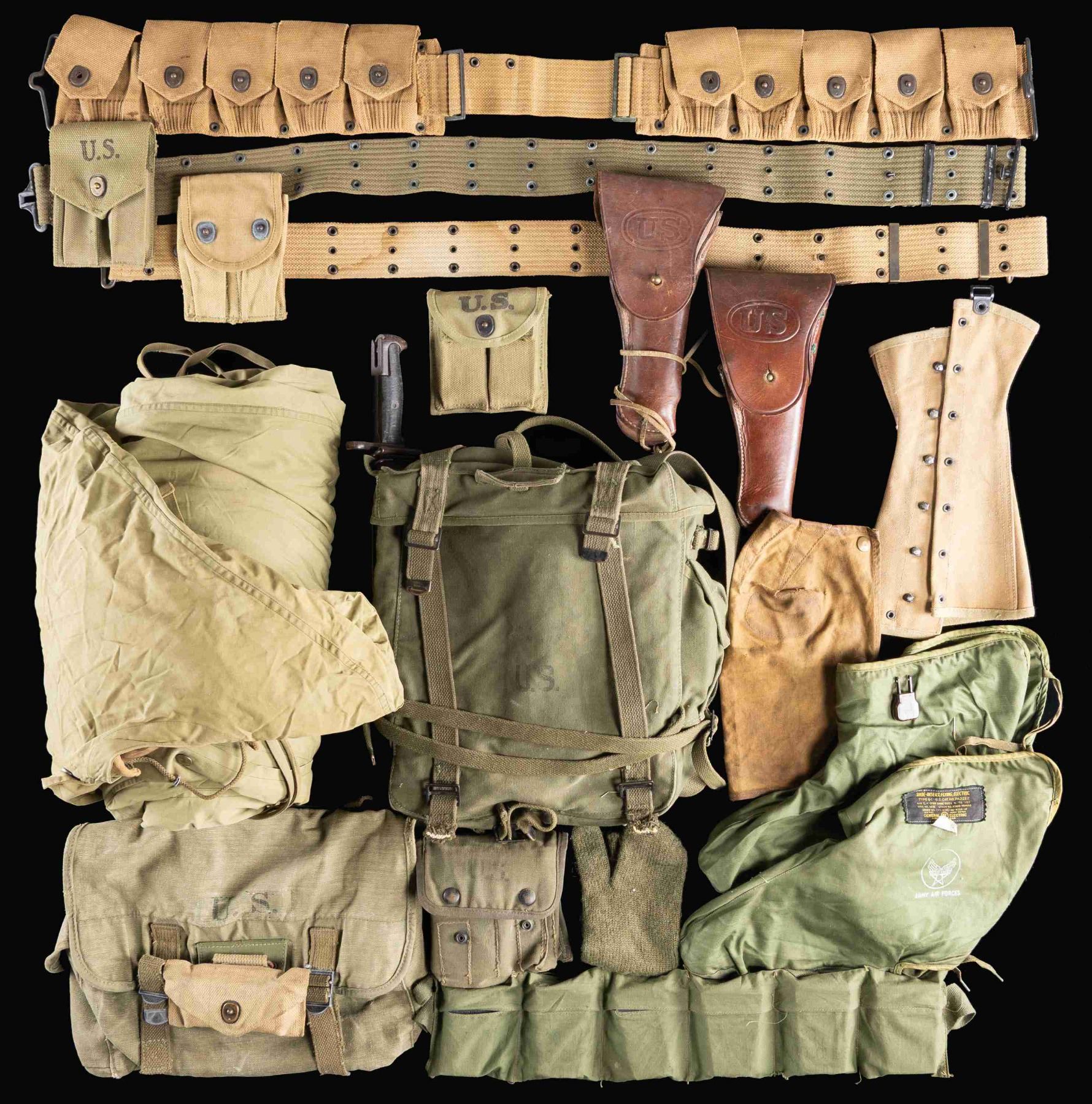 This group consists of 1 / WWII GI sleeping bag. 1 / Dual 30cal carbine clip pouch with clips. 1 / WWII OD backpack with an attached M1 bayonet & scabbard. 1 / Pair of Army Air Forces electric boot liners. 1 / Partial WWII OD first aid kit. 1 / OD WWII pistol belt with clip pouch and a leather 45cal automatic holster. 1 / Khaki OD WWII pistol belt with clip pouch and a leather 45cal automatic holster. 1 / US mussette bag with first aid kit attached. 1 / WW1 M1918 khaki 10 pocket ammunition belt. 1 / Breach cover for a 1903 Springfield. 1 / khaki puttee. 1 / OD wool mitten. 1 / Post WWII 6 pocket disposable 30cal bandolier. CONDITION: all items generally show light wear. Leather holsters are a bit dry. (02-24020-3/BF). NON-GUN. $250-450.