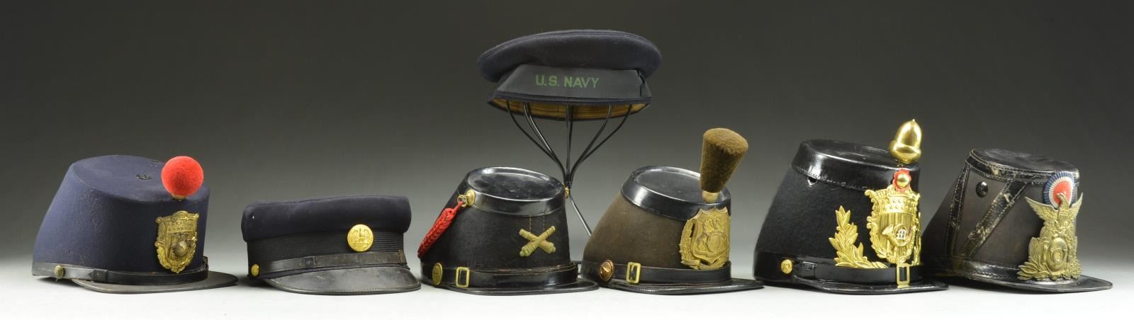 4) MARINES. A late 19th century Marine Corps shako with a dark blue felt body with vent hole in the crown. Shield front plate with central EGA. Chinstrap is terminated by small Marine Corps buttons. Leather visor. Large interior label “CHAS. F. BUSH, CONTRACT OF 1890, MILITARY, NAVAL GOODS, AND ALL KINDS OF Society Regalia, 387 WASHINGTON STREET, BOSTON.” Hat is equipped with a small red spherical pompom. CONDITION: shako remains quite strong but shows areas of significant mothing.
