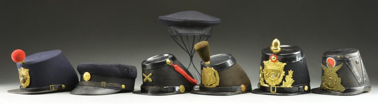 7) MILITIA. A Civil War Period French import militia shako of all leather construction. Large eagle front plate with central hunting horn. Above the front plate is a red, white & blue painted metal cockade. No pompom. CONDITION: shako shows light to moderate wear overall.