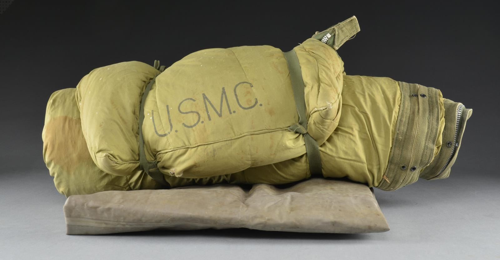 1) M1949 ARCTIC SLEEPING BAG. Markings include "BAG, SLEEPING, ARCTIC, M-1949". "OUTER BAG." "SIZE REGULAR" "Dated Feb. 51" "CARE & CLEANING INSTRUCTIONS". Bag is OD green w/ zippered closure & cloth tie straps. Marked "USMC". CONDITION: bag is in good to very good condition w/ very light wear, staining & several sm. tears.