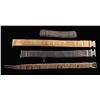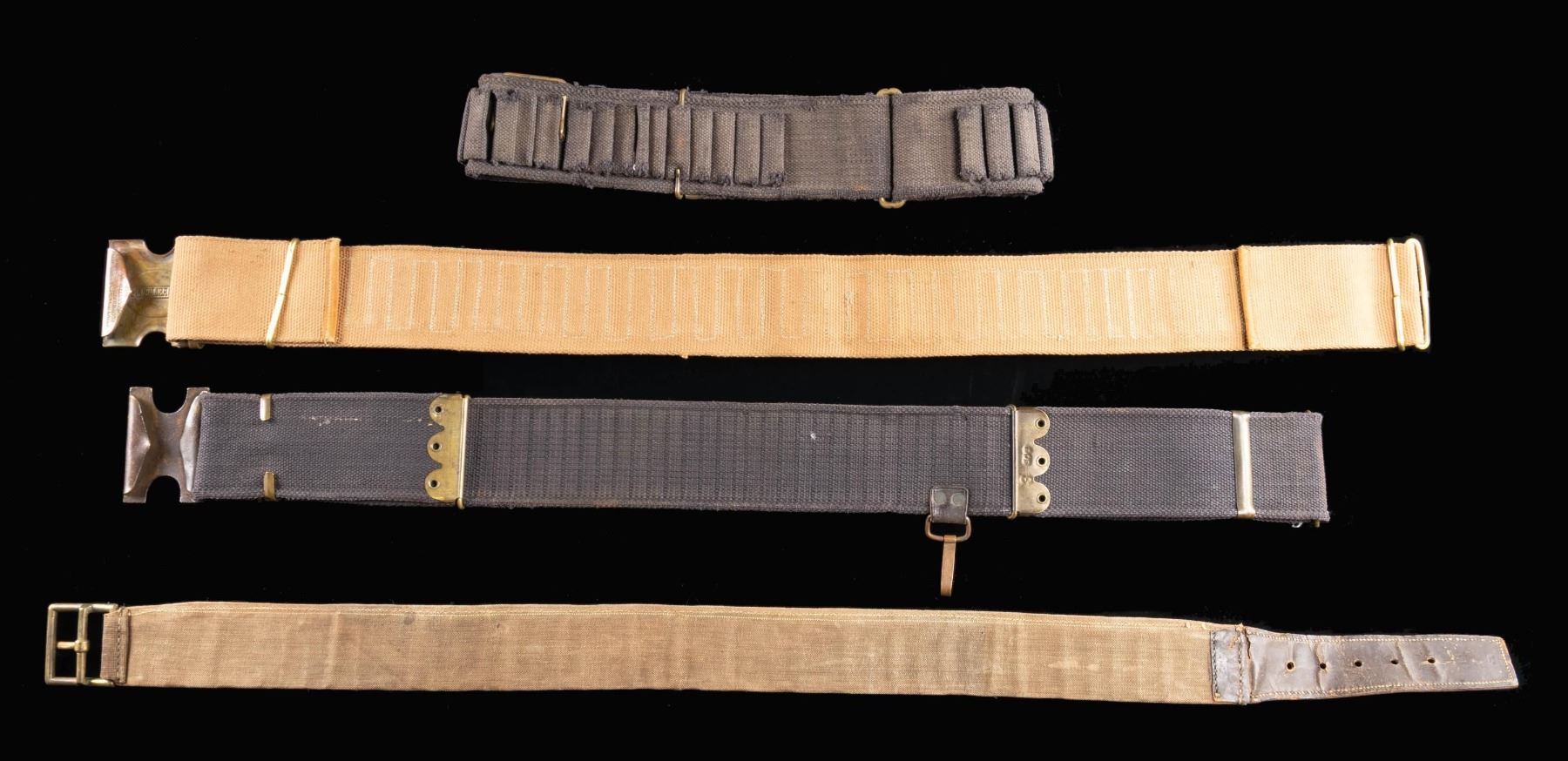 This group of belts includes 1 US M1876 cartridge belt with brass frame buckle. several loops have losses or cracks. 1) Mills marked blue woven cartridge belt with a "C" closure for 45-70 rounds. 1) Scarce US M1887 blue woven cartridge belt with an early H-style plate. The double loops for 30-40 Krag ammunition indicate issue after 1894. There is a permanently attached hook/loop at the bottom, likely for an entrenching tool. 1) Civilian tan cartridge belt with a Mills marked "H" style buckle that reads " OLD RELIABLE " in an oval on the face. CONDITION: belt and buckles show light wear except as noted above. (02-25212-2/BF). $400-600.
