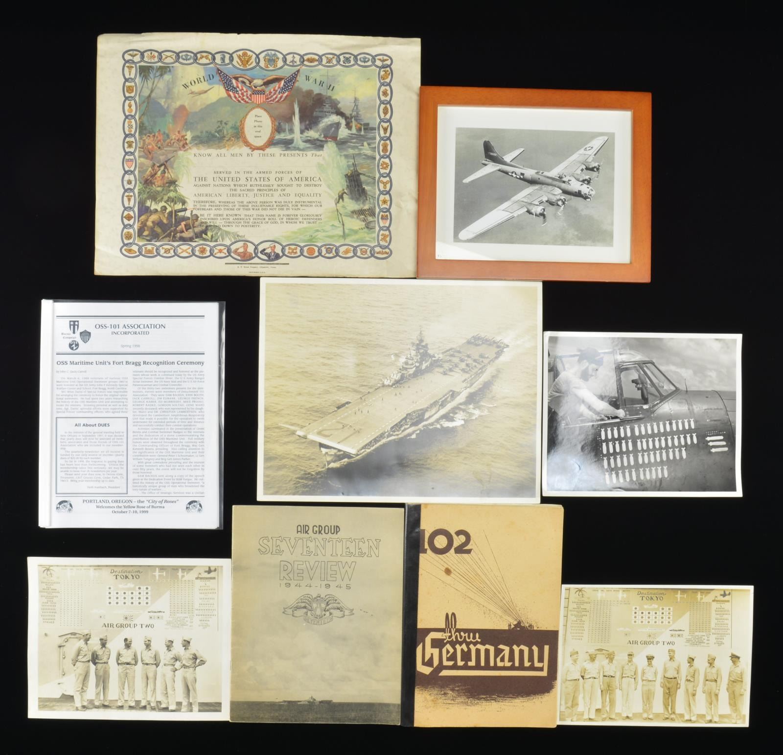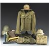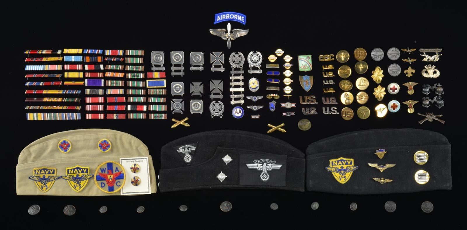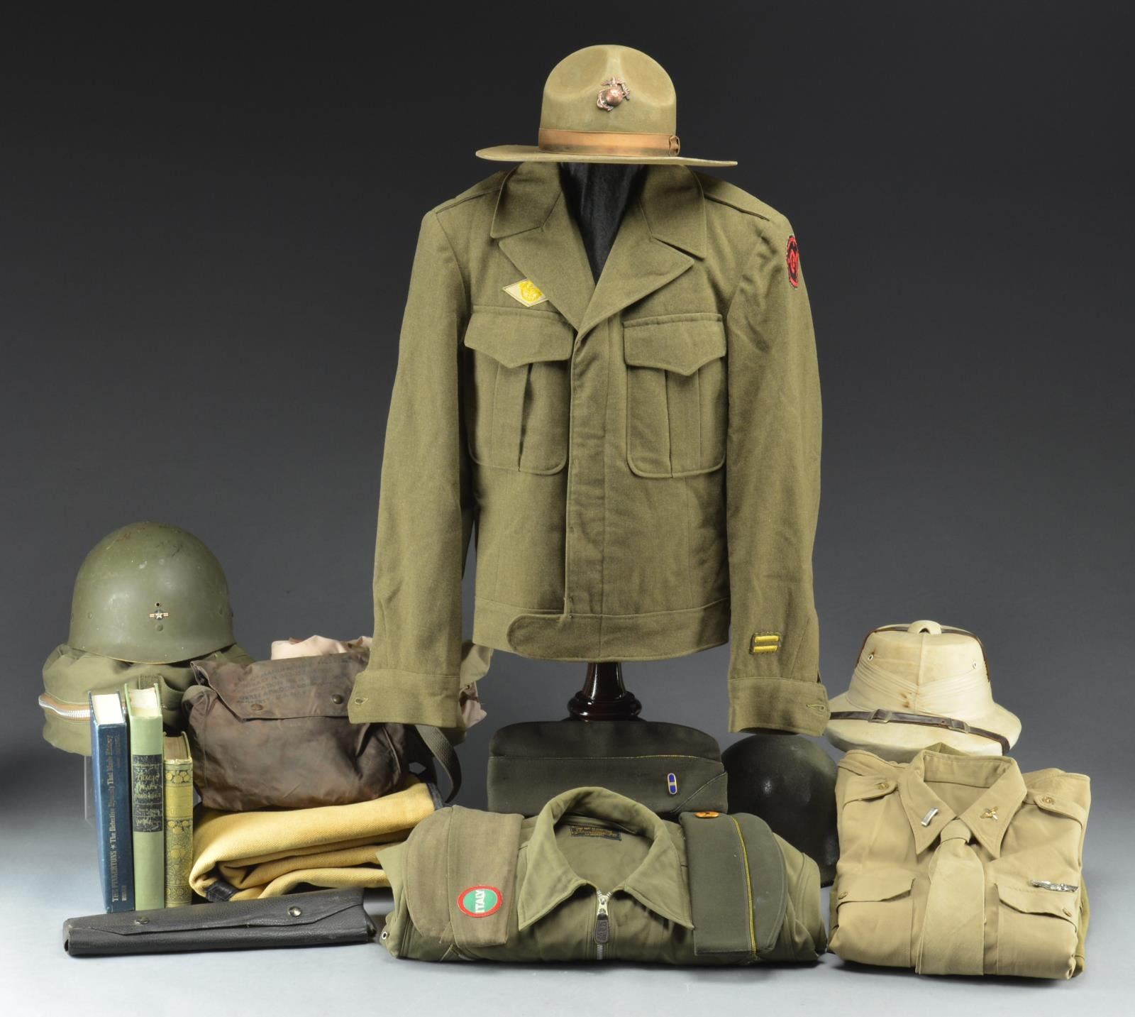 MORE. This widely varied group consists of a WWII Fifth Air Force uniform shirt w/ navigator wings attached above the pocket. Collar insignia is correct for a 1st Lieutenant & tie is included. / 3 Books titled, “The Pinkertons”, “Tragic Years” & “The Poetical Works of Mrs. Hemans”. / A framed Bob Seger “Night Moves” album. / A framed photo of a 4 engine bomber. / 1 Angelus gun cleaning kit. / 1 Canvas gun sleeve. / 1 Book titled, “The 102nd Infantry through Germany”. / Various photos of Air Group 2. / 1 WWII Army shirt w/ Ruptured Duck insignia. / 1 Overseas cap w/ red, white & green Italy patch on the left side. / 1 Overseas cap w/ an orange & black DI on the side featuring a bucking bronco & cowboy. / 1 Overseas cap for a warrant officer. / 1 WWII Ike jacket. / 1 US Navy equipment pouch possibly for a flotation device marked, “DURKEE ATWOOD COMPANY PROPERTY OF US NAVY”. / A 1 piece Air Force flying suit Type L-1. / 1 Sm. tin o various military insignia, clutchbacks, keys, etc. / 1 Dark blue overseas cap w/ a Navy V5 patch. / 1 Pair of Navy V5 wings. / 1 Navy sm. size pilot wings. / 1 Khaki Navy V5 overseas cap. / 1 Lg. & 2 sm. Women’s Ambulance Driver Corps patches & 2 metal collar insignia. / 1 WWII German NSKK overseas cap. / 1 WWII German NSKK flat bullion uniform eagle. / 1 Lg. riker mount frame containing a variety of ribbon bars, shooting qualification badges, collar disks, hat insignia, rank insignia & much, much more. / 1 WWII period helmet liner. / 1 Post WWII period helmet liner. / 1 Post WWII helmet liner in zippered carrying bag. / 1 British pith helmet that was made in India. / 1 Marine Corps drill instructor hat. CONDITION: as expected condition on this lot varies widely. Most items show light wear. PROVENANCE: Collection of Brian C. Pinkerton. (02-15462/BF). $500-750.