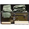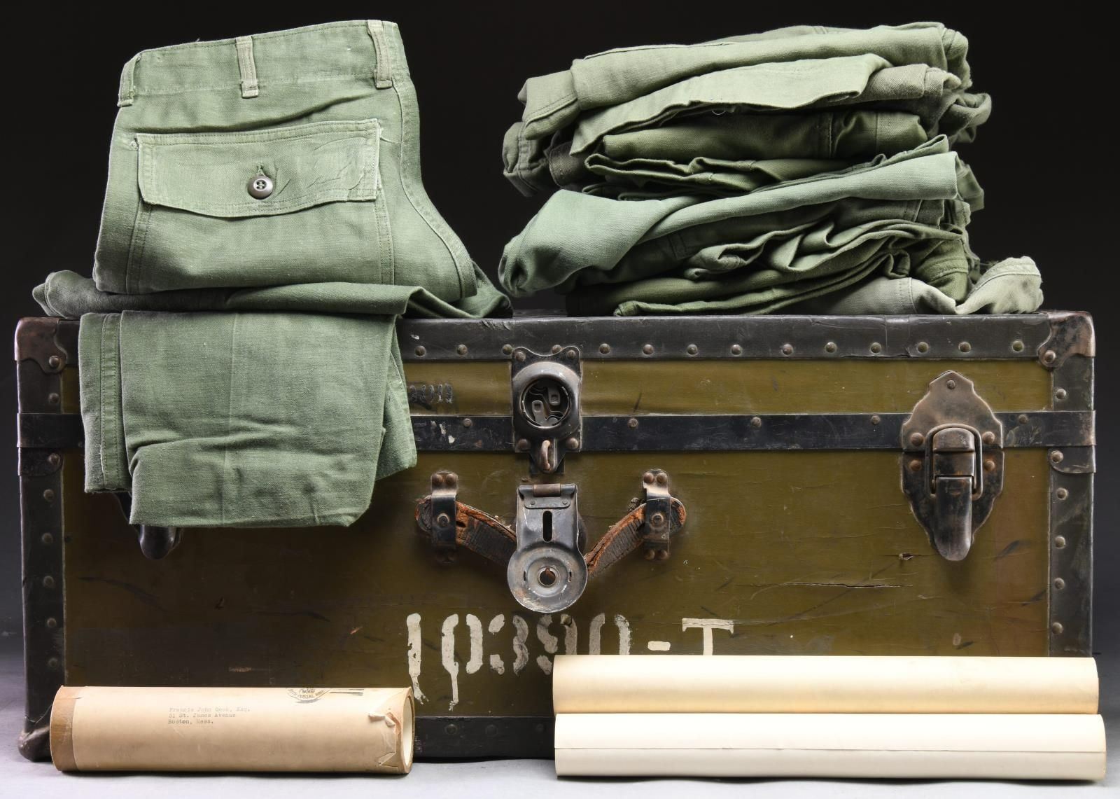 This group includes 9 pairs of OD pants, mostly from the post-WWII era. / 1 OD green duffle bag. / 1 Pair of khaki pants. / 1 Diploma from Saint Paul's School of Cambridge, MA. / 1 Diploma from Boston College Latin School. / 1 License to Practice Law in the state of Massachusetts. / 2 Pamphlets from Saint Paul's School. CONDITION: all items show light wear, with the exception of the khaki pants & duffle bag. (02-19665/BF). $100-250.