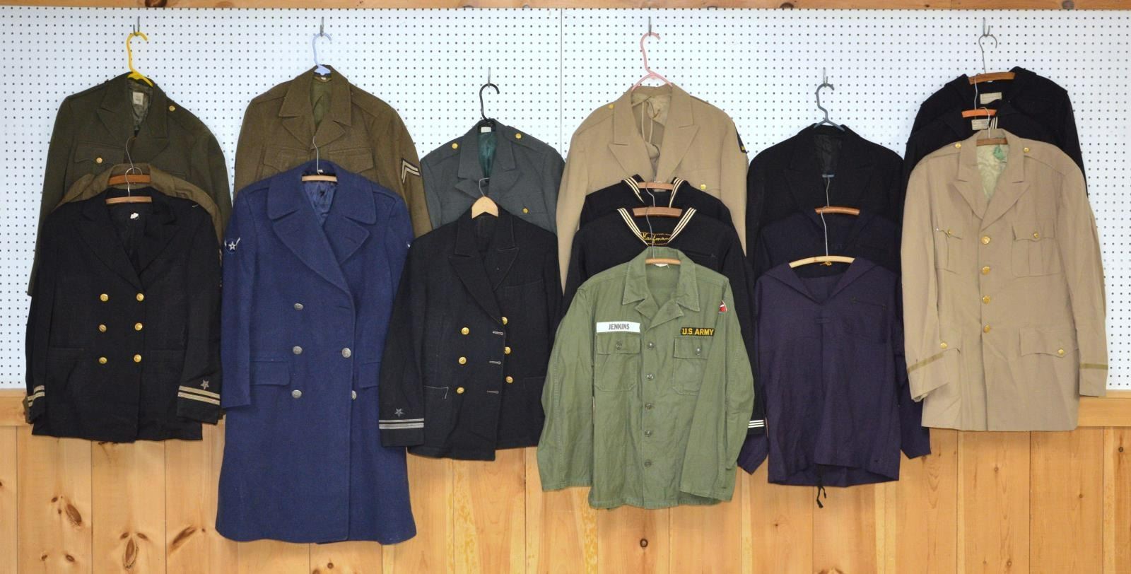 This lot includes 1 officer's OD tunic with no insignia. / 1 WWII Ike jacket for a Corporal. / 1 WWII Officer's tunic with no insignia. / 1 WWII khaki tunic with a VFW Maine patch on the left shoulder & matching pants. / 1 WWII era Naval uniform coat for a Lieutenant. / 4 WWII era dress blue crackerjack jumpers. / 2 Pairs of WWII era dress blue crackerjack pants. / 2 WWII era plain wool crackerjack blue jumpers with pants. / 1 US Air Force enlisted blue overcoat. / 1 WWII era Naval Officer's tunic for a LTJG with pants. / 1 WWII Ike jacket for a Master Sergeant. / 1 WWII era Naval Officer's coat for a Lieutenant. / 1 WWII era Army Officer's khaki tunic with no insignia. / 1 Post-WWII uniform shirt for the 78th Division. CONDITION: uniforms generally show light wear & are quite clean. (02-19715/BF). $100-300.