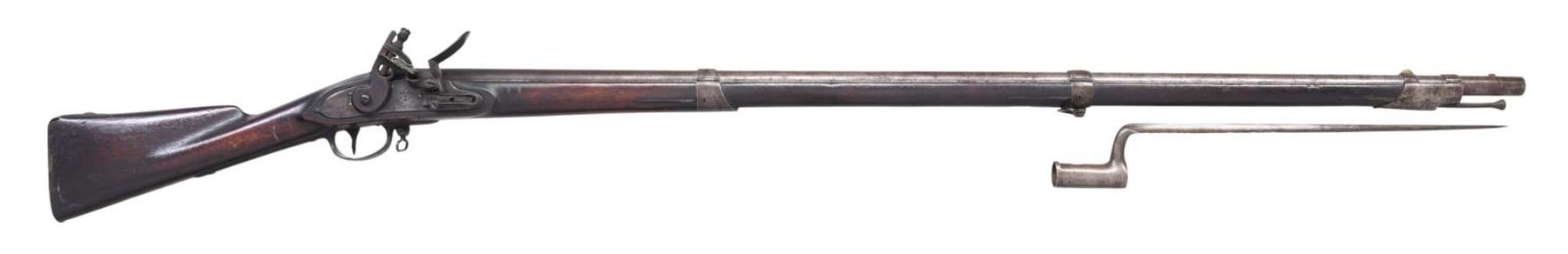 Cal. 70. S# NSN. Standard configuration: the 44-1/2" barrel is stamped "P (eagle head) V" and "US" at the rear and attaches to the stock with three spring-retained bands. Lock with chamfered plate dated "1808" on tail is fitted with chamfered cock with straight spur, inset rounded pan, frizzen with straight toe, and feather spring with spear finial. The plate is marked "US" in script over an eagle and "SPRINGFIELD" in arch. The walnut stock with fluted comb is iron-mounted. Buttplate is dated "1808." The trigger guard has a semi-pointed front finial and a rounded rear. Sling loops are screwed. Stock has a US inspector's mark on the left side, and "WC" is stamped at the rear of the trigger guard tang. UNATTACHED ACCESSORIES: musket comes with the correct-style, unmarked triangular bayonet with a 16" blade. A large dot is stamped at the base and on top. Bayonet will fit the musket with some work; it is presently too tight. CONDITION: fine. Metal parts with gray to brown patina with scattered pitting. Wood exhibits its original finish with added oil. Hand wear is evident on high edges and at normal carry points. Bore is pitted. Lock is good. Lock fits mortice tightly, and the assembly mark "c" is on most internal parts, including the screw that retains the pan. Correct type cock, a possible replacement with a newer screw. Lock markings are sharp and clear. "US" on the barrel, somewhat difficult to see. Considerable erosion is evident in the touch hole and juncture of the pan and barrel. Bayonet has a gray to brown, smooth patina overall. A very attractive musket. (01-24447/MGM). ANTIQUE. $1,500-2,250.