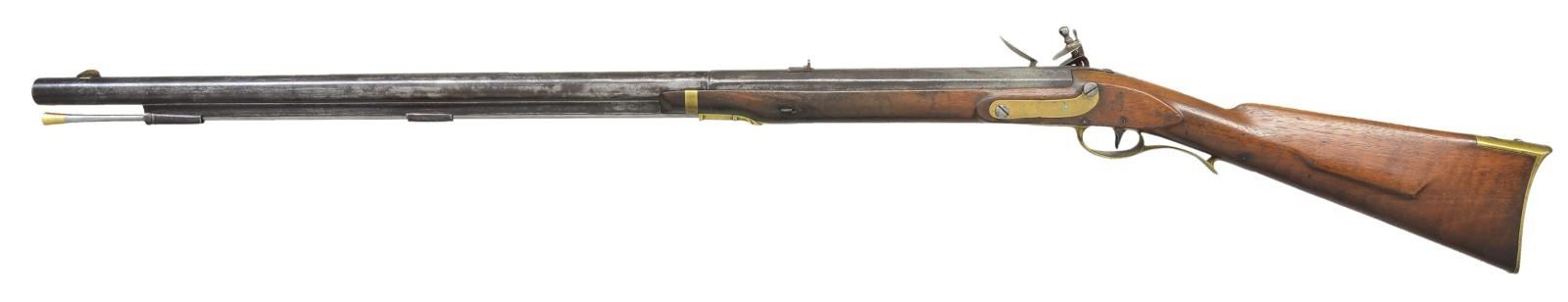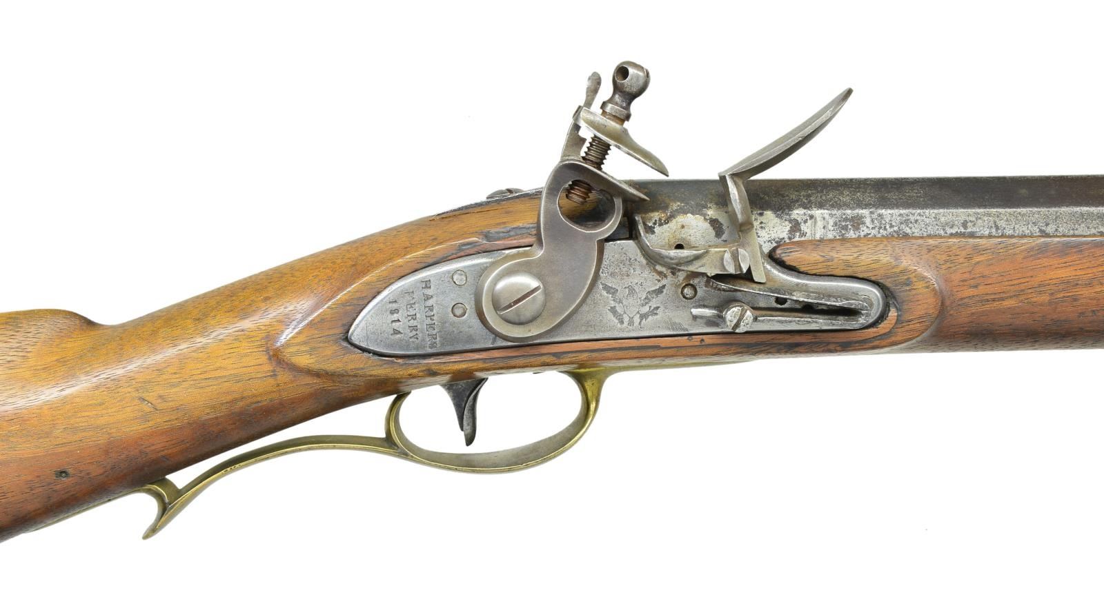 DATED 1814 RECONVERTED. Cal. 54. NSN. The 33 1/4" octagon to round barrel with under rib is fitted with rifle sights and has oval cartouches at rear marked "US" and "P" under a later style eagles head. Lock with beveled plate is fitted with reinforced cock, integral rounded pan, bridled frizzen and feather spring with small spear finial. A heraldic eagle with "US" on shield is at center, tail is marked "HARPERS" "FERRY" "1814". Walnut half stock of Kentucky styling has small cheekpiece on left side and is brass mounted. Heavy buttplate has iron release button for long brass patchbox on tang, trigger guard has spur at rear forming grip and sideplate is curled. Inspectors markings are visible on left side opposite lock. Steel ramrod with brass tip mounts through two beaded iron pipes and matching brass thimble. CONDITION: good. Barrel cleaned to silver highlights over brown pitted surface. Lock is mostly bright, reconverted with new cast cock, frizzen and pan. Feather spring appears to be old. Wood shows old refinish with sharp edges softened. Bottom edge of lock inletting is fitted with new wood. Inspectors marks are good, but not crisp. Rear sight and ramrod are reproductions. Bore is very good with strong rifling throughout and lightly pitted. Lock is operable. PROVENANCE: From the Lifelong Collection of Glen E. Mattox. (01-22465/MGM). ANTIQUE. $1,500-2,000.