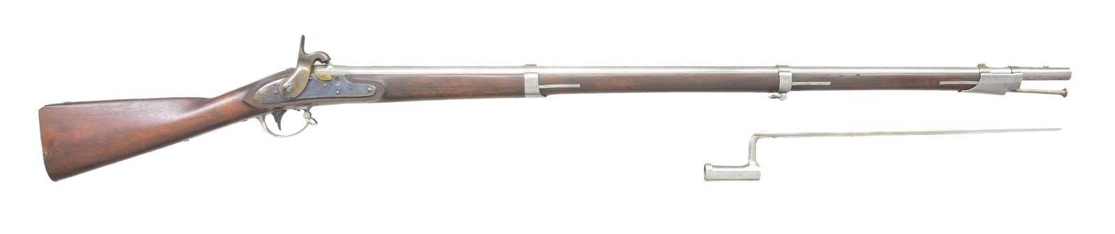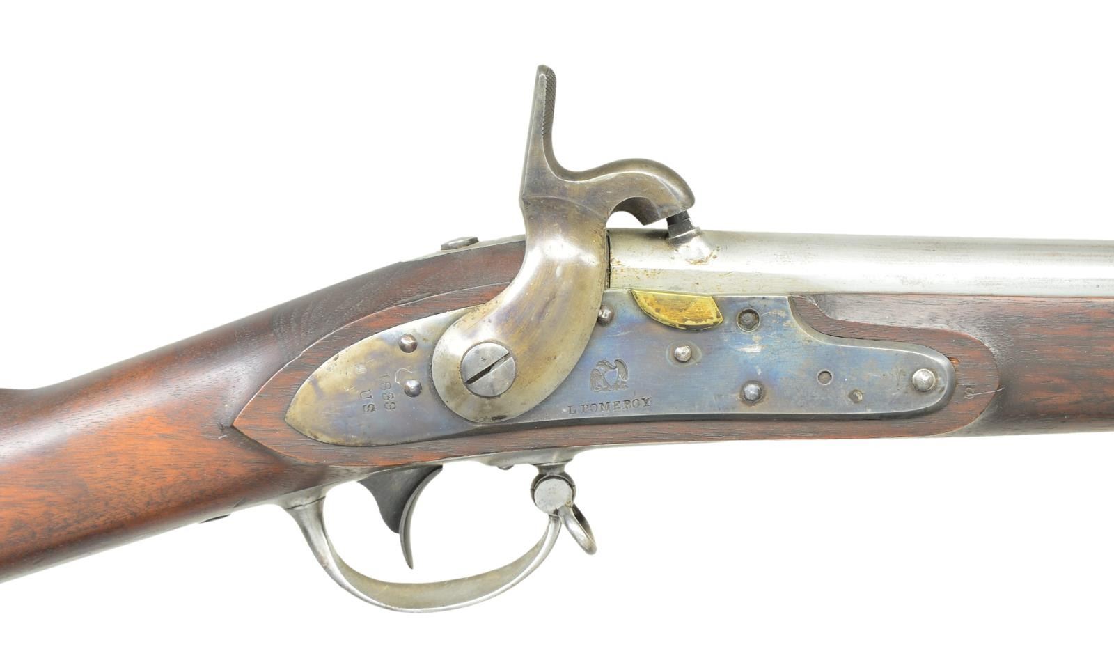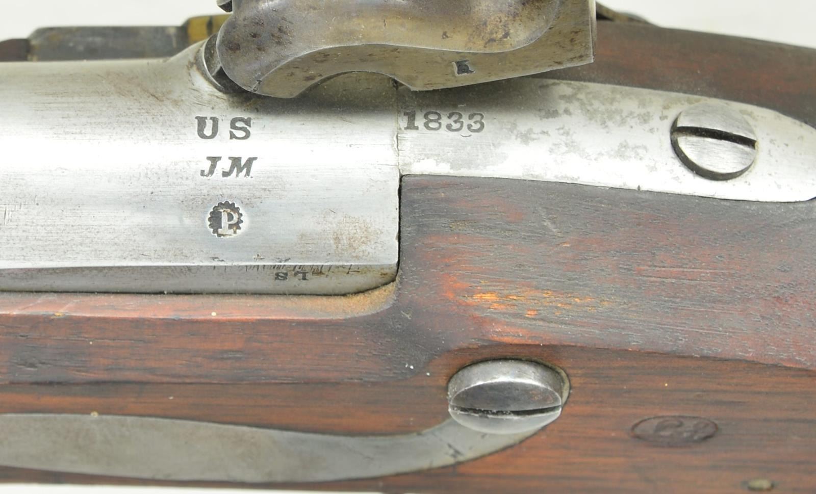 POMEROY IN SUPERB CONDITION AFTER CONVERSION TO PERCUSSION WITH BAYONET. Cal. 69. NSN. L. Pomeroy of Pittsfield Mass. produced over 21,000 muskets between 1817-36. This high condition example has 42" barrel finished bright and attached by three spring retained bands. Breech is stamped "US" "JM" and with "P" in circle. Barrel tang is dated 1833. Barrel shows conversion to percussion by the Belgian system with metal added to support nipple. It appears this is the only method used by National Armories. Case hardened lockplate has all remaining holes plugged, a piece of brass let into pan socket and round bodied percussion hammer installed. Lockplate is marked with eagle over "L. POMEROY" at center. "1833" over "US" is on rounded tail. Walnut stock is iron mounted. Buttplate is stamped "US". Marks "G" "20" & "DG" in oval are at top of comb. "LS" in oval as well as individual letters "LS" are on left side of stock opposite lock. Left side of barrel is also stamped "LS". "J.S." is in an oval behind trigger guard tang. UNATTACHED ACCESSORIES: musket is accompanied by socket bayonet with 18 1/4" triangular blade stamped "U.S.". CONDITION: exceptionally fine. Most metal parts retaining nearly all bright polish done at time of arsenal conversion, with perhaps some later cleaning. Lock retains nearly all case hardening color with high edge wear. Stock is very fine retaining nearly all original oil finish with a few marks, some deep. Inspector's marks are crisp. Bore is bright and shiny. Mechanically fine. Original button ramrod is browning at tip. Bayonet retains nearly all of its bright polish. PROVENANCE: From the Lifelong Collection of Glen E. Mattox. (01-22475/MGM). ANTIQUE. $2,000-3,000.