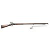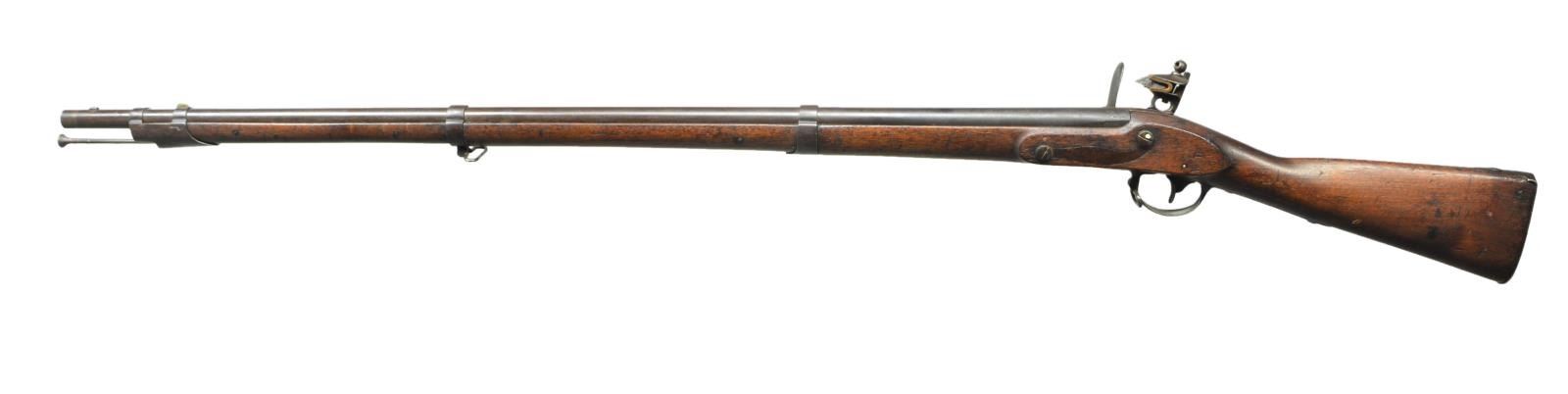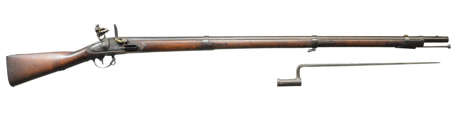 RECONVERTED FROM PERCUSSION WITH BAYONET. Cal. 69. NSN. 42" barrel has "V" "P" and eagle head proofs at rear. Lock reconverted with old parts has eagle and "US" at center and "HARPERS" "FERRY" "1821" on tail. Walnut stock is iron mounted. Remnents of inspectors marks are left side along with the initials "WB". UNATTACHED ACCESSORIES: socket bayonet of the correct type with 18" triangular blade marked "US". CONDITION: good "as reconverted". Assembly marks do not match on lock nor does patina. Metal parts are mostly smooth brown patina. Stock refinished. Lock good. Frizzen does not fit pan well. Bayonet is overall brown patina. (01-22611/MGM). ANTIQUE. $1,200-1,600.