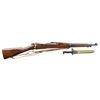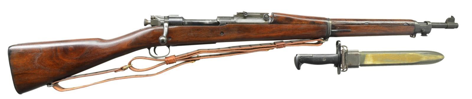 RIFLE. Cal. 30-06. S# 1468553. Bbl. 24". Rifle purchased from Director of Civilian Marksmanship & includes original matching S# receipt for this rifle from Department of the Army, Office of Director of Civilian Marksmanship dated May 2, 1950. S# indicates rifle mfg. in 1934. Springfield Armory bbl. dated June 1928 & was likely installed at time of Rock Island arsenal overhaul on the later receiver. Ladder rear sight graduated to 2,850 yards w/ volley notch. Dished elevation knob. Flat windage knob. Blade front sight. Swept bolt handle. Bolt marked on top w/ "2" & "7". Bolt sleeve is Smith Corona. All milled furniture except butt swivel. Stacking swivel is not installed but is included. Stacking swivel screw is not present. Fine checkered trap buttplate. Walnut stock set. Faint markings on left side included boxed "FJA" & boxed "RIA FK". Circled P under grip. Stock made w/out grasping grooves & has 2 recoil bolts. Brown leather military type sling. UNATTACHED ACCESSORIES: 9 7/8" fullered blade M1 bayonet w/ plastic scabbard. Bayonet was correct for both 1903 & M1 rifles. Bayonet marked on left ricasso "U.C." "U.S." & "FLAMING BOMB". Ribbed composite grips. Bayonet retains original finish around handle. Blade has been sharpened resulting in extensive loss of finish. US marked scabbard has heavily worn surfaces showing laminations underneath. Includes original matching S# receipt & synthetic padded hard case. CONDITION: stock set has very nice arsenal rework finish w/ very light wear & scattered sm. handling marks leaving the markings faint but visible. Metal finish is lightly worn thinning original parkerizing w/ scattered handling marks. Bore is shiny w/ lightly worn lands. (21-4510/RW). CURIO. $500-700.
