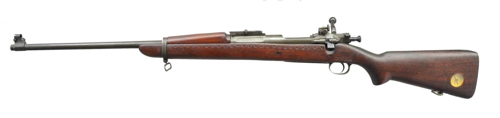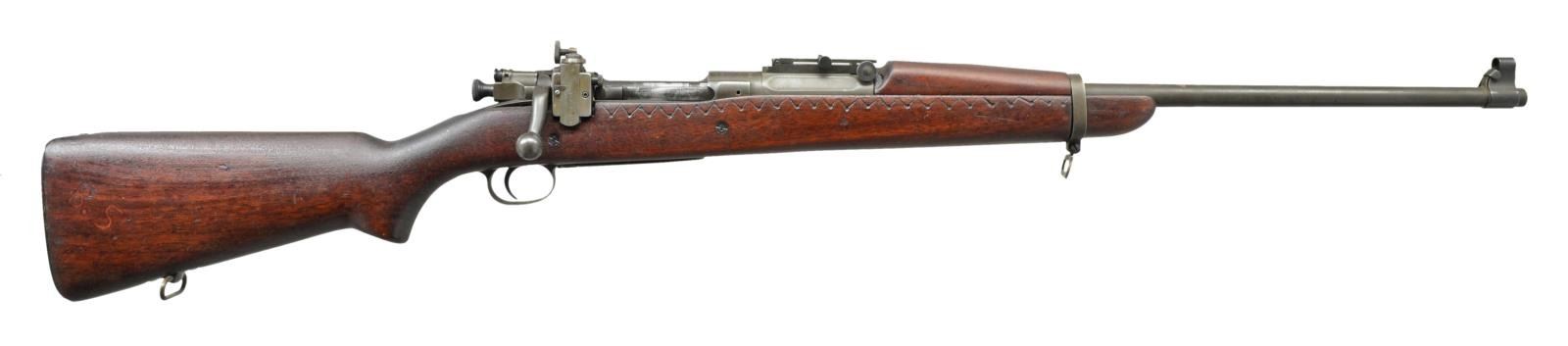 RIFLE. Cal. 30-06. S# 1301012. Bbl. 24" marked behind front sight "SA" "flaming bomb 6-31". 1903 Bolt w/ swept handle. Bolt handle is marked underneath w/ 3. Marked on top "N.S.". Lyman model 48 rear sight fitted on receiver bridge. Rifle retains original ladder sight graduated to 2850 yards. Blade front sight w/ US marked sight protector. Stamped lower band & swivel. Milled butt swivel. Stamped buttplate. Nickel plated oiler in butt. Walnut stock set w/ "C" type buttstock. Forend has been removed approx. 2 1/4" ahead of lower band. Balance of forend & upper band is not present. Handguard has been removed at forward edge of lower band. Retaining the area between band & rear sight. Stock has been given hobbyist gunsmith type refinish & carving along the top edge between bbl. band & rear of mag. Buttstock has added letters on right side "B.S." Compass installed on left side of butt. CONDITION: stock set has crazed appearance in the varnish finish w/ loss of wood inletted areas. Large missing chip on right side of receiver tang. Metal has 50% parkerized finish w/ light wear & scattered fine oxidation. Bbl. has lathe marks for approx. 6" beyond stock tip. Lyman sight has been mounted w/ Allen head screws. Lightly worn bore w/ appearance of frosting in grooves. (21-2609/RW). MODERN. $300-450.