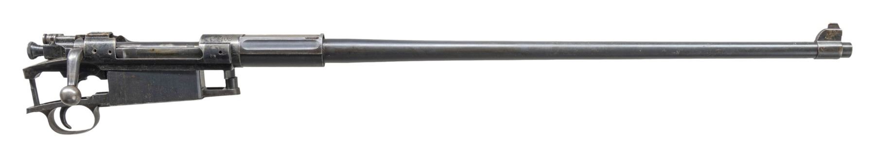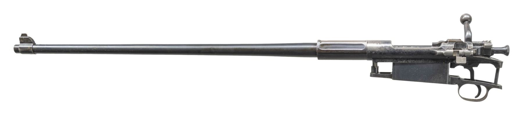 ACTION. Cal. 30-06. S# 234408. Bbl. 24". Barrel marked behind front sight "RIA / flaming bomb / 6-13". Front sight blade is sporting type w/ white bead. No rear sight is fitted. Barreled action has been modified by drilling the side of the bridge for a receiver sight. Top of bridge has large hole approx. 7/32" in diameter. Receiver has not been drilled for Hatcher hole. Unmarked bolt w/ straight down handle. Rear sight base remains in place. Top has been modified to a lower profile & will no longer accept the movable base. Milled trigger guard assembly. Grooved trigger. CONDITION: receiver has its mottled thinning original blue. Barrel retains most of its original blue finish. Top of rear sight base is in the white. Trigger guard has thinning worn original blue. Shiny bore w/ lightly worn lands & hint of frosting. (25-2918/RW). MODERN. $100-200.