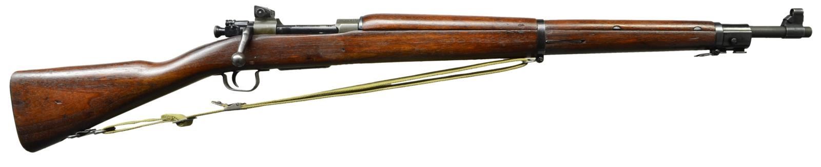 Cal. 30-06. S# 3786981. Bbl. 24" w/ 3-44 date, RA & flaming bomb markings. All visible parts are of Remington mfg. Aperture rear sight graduated to 800yds. Blade front sight w/ protective hood. Walnut stock w/ two pin reinforcement. Left side of stock has "RA", boxed "FJA" & ordnance wheel markings. Circled "P" firing proof on bottom of wrist. Bottom mounted sling swivels w/ GI canvas sling. CONDITION: walnut stock has some scarring from band removal, scattered dirt staining, dings & handling marks. Metal retains 90% original blue & parkerized finishes w/ some oxidation on bolt handle, scattered fading & high edge wear. Very good bore w/ some light frosting. (22-4138/MJC). CURIO. $500-800.