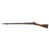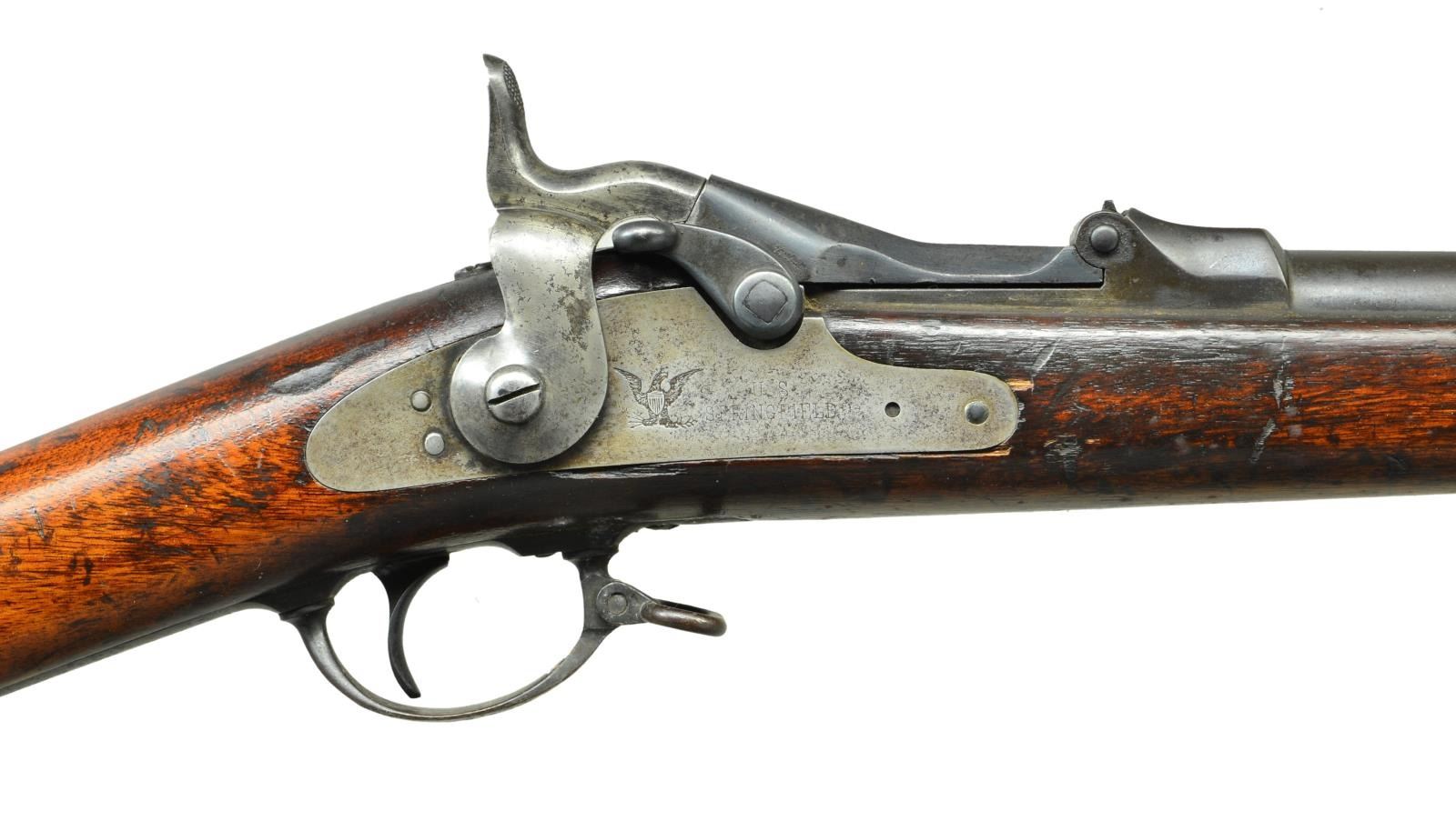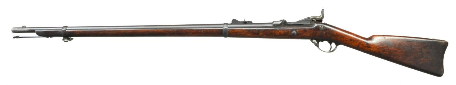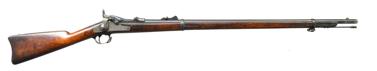 Cal. 45-70. Ser. #85499. Bbl. 32". Model 1877 ladder rear sight marked on forward left end w/ "R" & adjustable to 1200 yds. Stud type front sight. Model 1873 non cupped ramrod. High arch 1873 dated breech block. 3 position tumbler. Late type hammer w/ beveled tip. 2 piece trigger guard assembly. Buttplate marked "US". Short comb 1 piece walnut stock. Inspector's cartouche is not readily visible. CONDITION: stock shows evidence of early rework finish rendering markings obscure. Stock has wear, staining & handling marks throughout. Sm. missing chips at forward edge of lockplate & notable deep scratch on right side below upper band. Metal has turned overall gray & patina w/ traces of blue. Light oxidation w/ spots of very fine pitting throughout. Bore has strong rifling & scattered fine pitting throughout. (01-21395/RW) ANTIQUE. $.400-600.