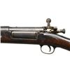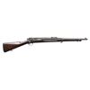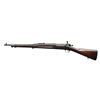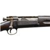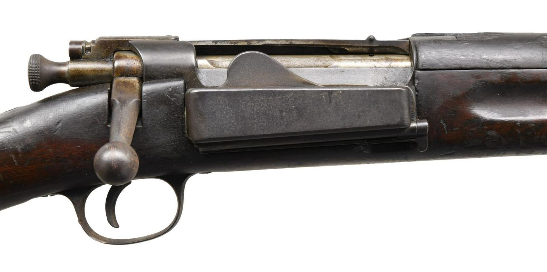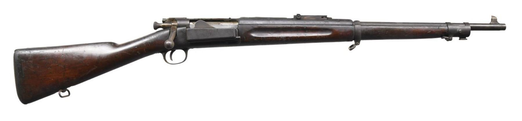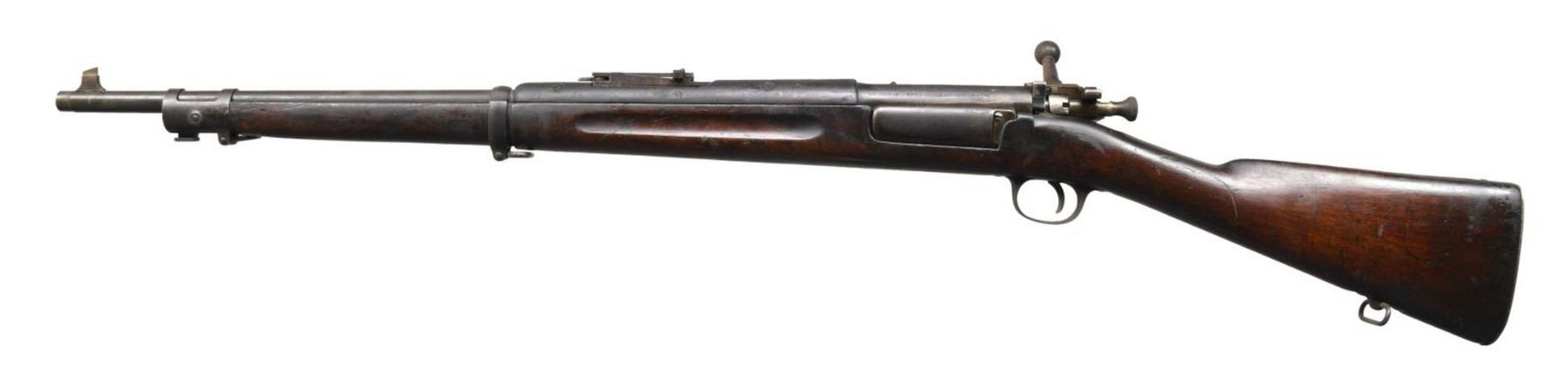 RIFLE. Cal. 30-40 Krag. S# 432785. Bbl. 22 5/8". A great many Krag rifles were modified after their service use to a short rifle configuration for use by private military academies & other schools. These modifications were done by companies by Bannerman's & Stokes, and the workmanship is usually not arsenal quality. Model 1901 ladder rear sight graduated to 2,000 yards. Blade front sight. Sight base has been reattached to the shortened bbl. by brazing, and the muzzle turned down to accept a bayonet. The stock has been shortened with a poorly fitted wooden filler piece. The upper band has been relocated. Stacking swivel has been broken. Walnut stock set. Stock is marked w/ faint circled "P" proof behind trigger guard. Smooth trap buttplate. CONDITION: stock set has arsenal rework type finish w/ notably dark stained appearance, notable wear, & handling marks throughout. Stock has notable but small missing chip behind receiver tag & ahead of buttplate tang. Hand guard has extensive missing chip & crack at rear over receiver ring. Metal has turned overall patina w/ areas of light oxidation & wear. Rear sight base screw is not present. Front sight base does not fit bbl. correctly. Fair, worn bore w/ moderate pitting throughout. PROVENANCE: from the estate collection of Thomas J. Mulligan. (23-1186/RW). MODERN. $500-700.