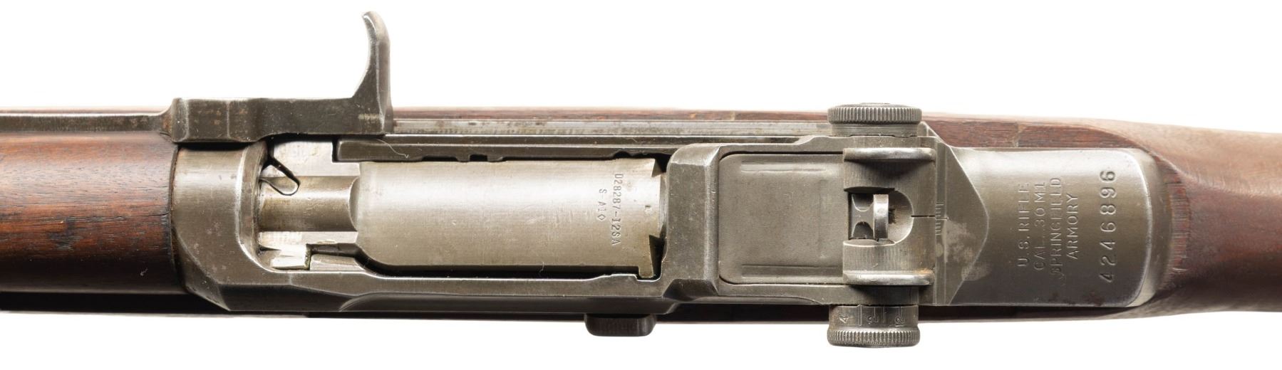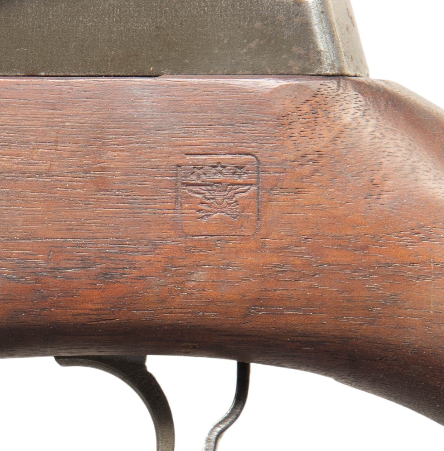 Cal. 30-06. S# 4246896. Bbl. 24". Barrel marked on right side with "SA 11-57". Throat gauges 6.0. Muzzle gauges 3.0. T105E1 aperture rear sight. Blade front sight with protective ears. All major parts markings except safety are marked "SA". Safety is marked "MXR". Stamped trigger guard. Walnut stock set. Buttstock marked with boxed defense "eagle" on left side. Marked under grip with encircled "P" proof. Marked at end of grip with bored soldier "8929". CONDITION: buttstock has crisp markings and bedding compound added in receiver area. Buttplate and rear of stock has notable oxidation and water stain from improper storage. Rear handguard has 2" crack between receiver ring and handguard retainer. Metal retains 50% of its original parkerized finish with scattered spots of oxidation and fine pitting throughout. Shiny bore with lightly worn lands. (25-5056/RW). CURIO. $800-1,200.