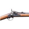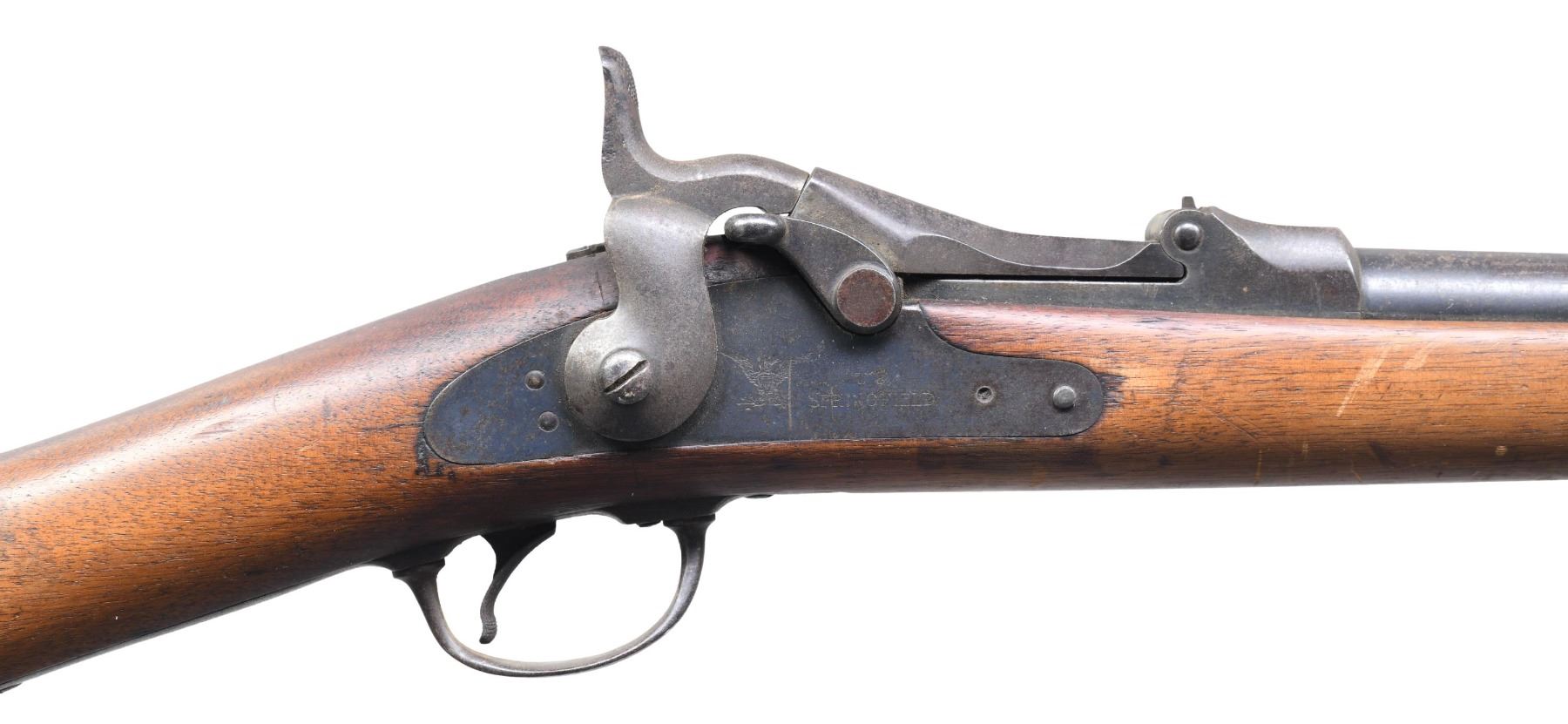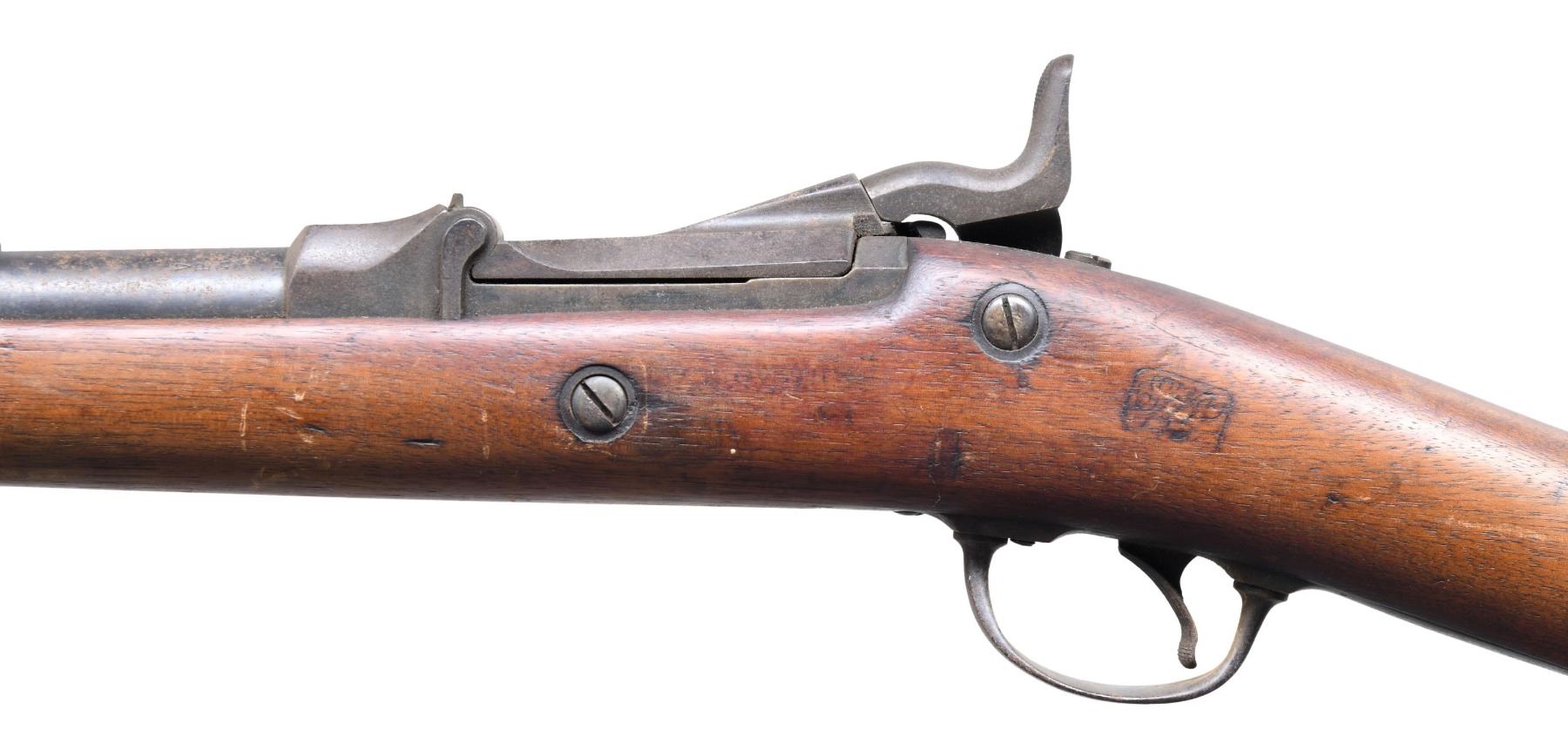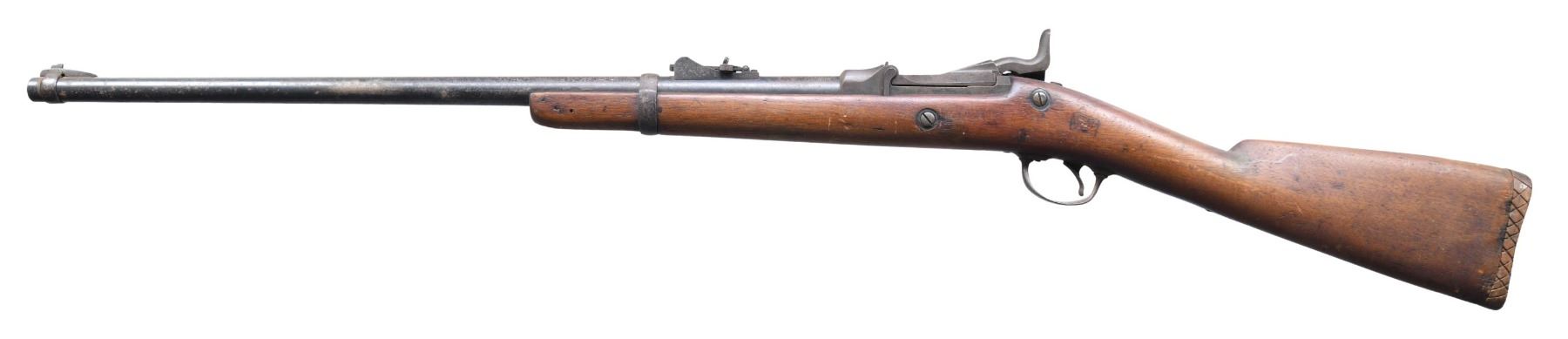 SINGLE-SHOT MILITARY RIFLE. Cal. 45-70. S# 280356. Bbl. 25". Receiver mfg. in 1885. Low arch breech block is dated 1873. Model 1879 open rear sight. Sight is marked "R". Sight is attached by slotless screws. Blade front sight dovetailed in ramp. Sight is fastened to bbl. by steel ring & is notably misaligned. Rifle has been sporterized by shortening the original bbl. & stock, removing the upper band in nose cap. Stock tip extends three inches beyond bbl. band. Comb has been reshaped slightly & added wood spacer buttplate. Two piece trigger guard. Low arch breech block. Three click tumbler. Flat lockplate is marked w/ eagle & "SPRINGFIELD". CONDITION: rifle shows hobbyist gunsmith workship. Stock has been refinished & has moderate wear, staining & handling marks throughout. Approx. 1 1/2" crack behind lockplate. Worn metal has traces of blue w/ extensive light oxidation & shallow pitting. Worn bore w/ oxidation in grooves & notable pitting & scratches at the forward end near the muzzle. (01-26217/RW). ANTIQUE. $200-300.