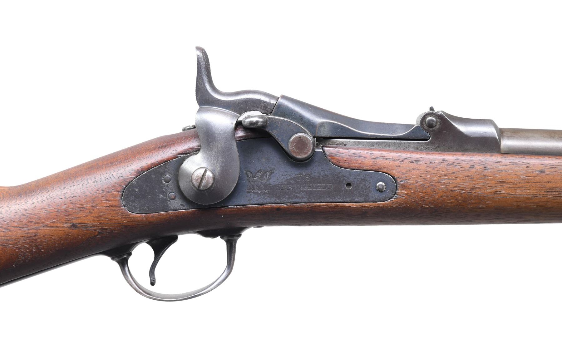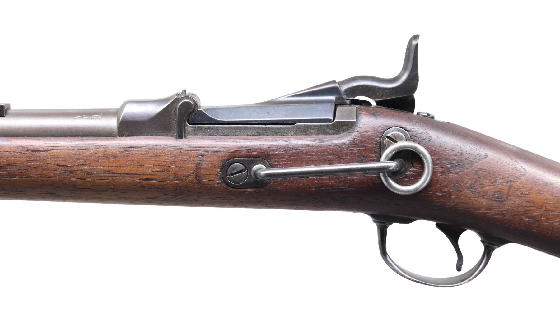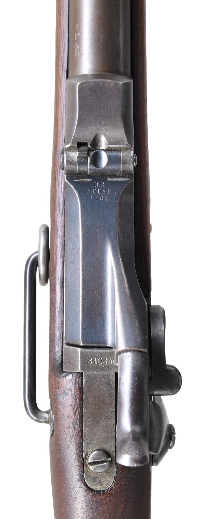 CARBINE. Cal. 45-70. S# 340356. Bbl. 22". S# indicates receiver mfg. in 1886. Low arch breech block is dated 1884 & is equipped w/ the aluminum-bronze alloy firing pin. Buffington rear sight marked "C" & graduated to 1,900 yards. Blade front sight w/ replacement. Carbine is equipped w/ the model 1890 sight protector bbl. band. Three click tumbler. Flat lockplate marked w/ eagle & "US SPRINGFIELD". Bbl. has "VP" eagle head proof. Long comb walnut buttstock w/ trap buttplate. Stock is equipped w/ saddle ring & bar on left side. Boxed "SWP" acceptance mark is faint. Date is not legible. Faint encircled "P" script proof behind trigger guard tang. CONDITION: stock has had a light restorative cleaning & has light wear, staining as well as scattered small handling marks throughout. Metal parts turning generally gray. Lockplate, hammer & breech block show generally more blue finish. Metal has light wear w/ scattered spots of light oxidation. Bore is bright w/ lightly worn lands & areas of very shallow scattered pitting. (01-26362/RW). ANTIQUE. $1,200-1,600.