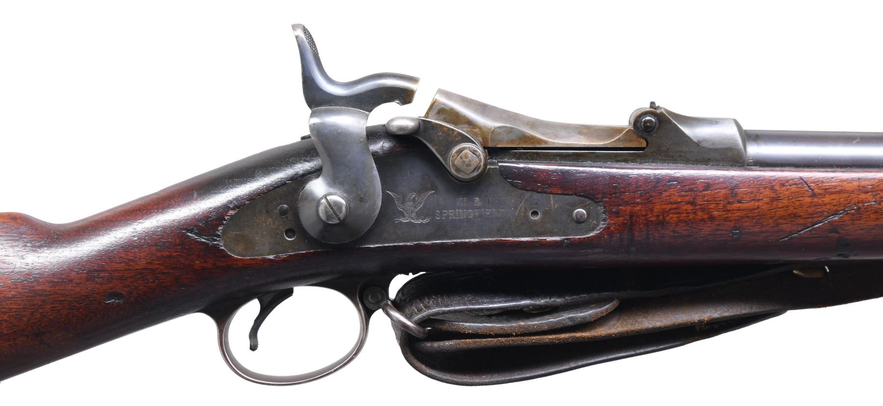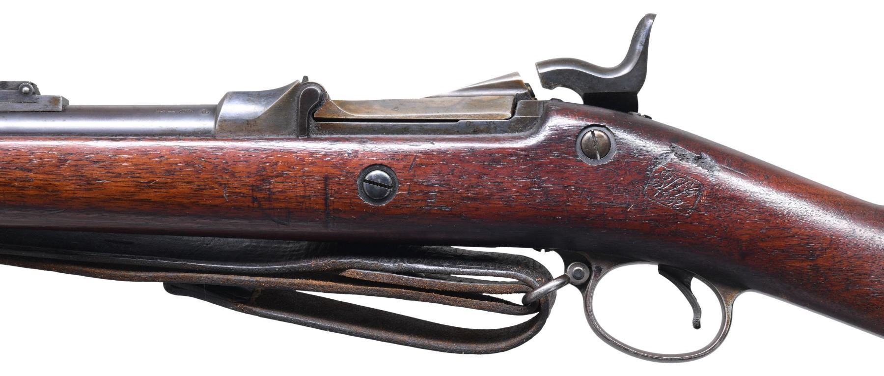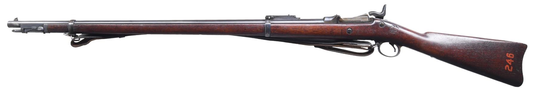 SINGLE SHOT MILITARY RIFLE. Cal. 45-70. S# 542813. Bbl. 32 1/2". S# indicates receiver made in 1892. Stock cartouche above trigger guard is boxed "SWP / 1892". Low arch breech block correctly marked "U.S. / MODEL / 1884". Bbl. has the "VP / eagle head" proof. Buffington rear sight marked "R" graduated to 2,000 yards. Blade front sight. Flat lockplate marked w/ eagle & "US SPRINGFIELD". Rod bayonet is present. One piece trigger guard. Walnut stock is equipped w/ trap buttplate. Besides the acceptance mark, additional markings include encircled script "P" proof under grip. Marked on left side of butt in red "246" rack number. Correct original single hook sling. Sling marked w/ "US" & is constructed from two piece of leather w/ stitched lap seam. CONDITION: stock has crisp markings & good appearance, however, it has numerous handling marks including light wear to be expected from long service. Notable dent in wrist above acceptance mark. Metal retains a good portion of its original blue w/ thinning light wear. Breech block & breech screw retain a large portion of case colors. Very good shiny bore w/ sharp lands. Sling has wear, scuffing & flexing. (01-26359/RW). ANTIQUE. $1,500-2,000.