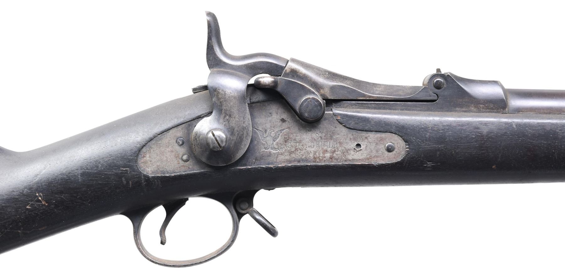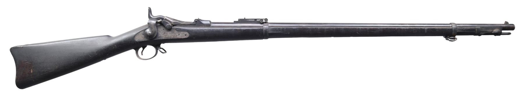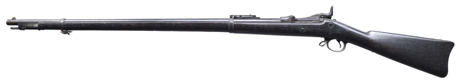 MILITARY RIFLE. Cal. 45-70. S# 510677. Bbl. 32 1/2". S# indicates mfg. in 1991. Has the correct 1884 breech block date. Buffington rear sight marked "R" graduated to 2,000 yards. Blade front sight. Flat lockplate marked w/ eagle & "US SPRINGFIELD". Ramrod bayonet has the deep locking notches. One piece trigger guard. Three click tumbler. Long comb walnut stock w/ trap buttplate marked on left side over trigger guard. w/ "SWP / 1890". Marked behind trigger guard tang w/ encircled "P" proof. Tiny letters "P.D.R.". Buttstock is marked on left side "A / S.F. / 31". Stock has two bands fastened by springs. CONDITION: stock has very dark original finish w/ moderate wear & handling marks throughout. Metal has traces of blue turning patina w/ light oxidation & wear. Bore has a degree of shine w/ strong & sharp lands. Grooves have light frosting & scattered small pits notable near muzzle. (01-26344/RW). ANTIQUE. $400-600.