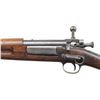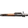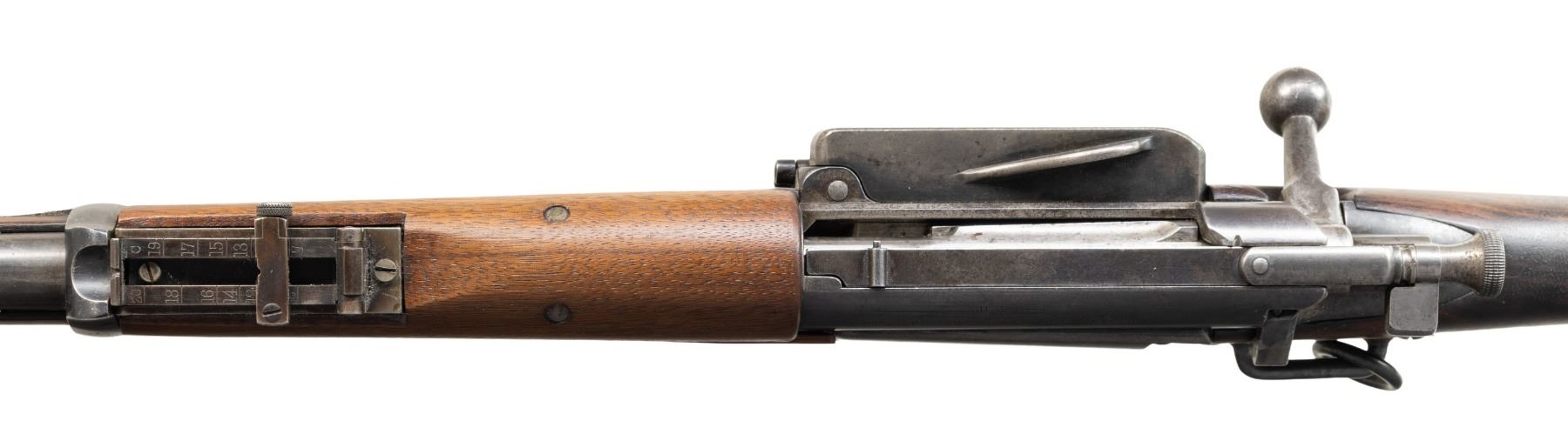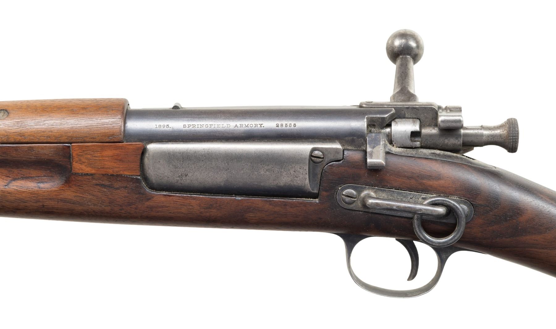 Cal. 30-40 Krag. S# 28565. Bbl. 22". Model 1896 ladder rear sight marked "C" on both sight base and top of slide. Graduated to 2,000 yards. Blade front sight. Receiver is not marked with model number, only the "1895" date. Unmarked safety. Walnut stock equipped with the correct saddle ring. Flared bolt handle seat. Sight barrel protector band secured by spring. Trap buttplate with curved toe. UNATTACHED ACCESSORIES: three piece cleaning rod and nickel plated oiler in butt. Handguard appears modified to accept the sight protector band. Handguard is equipped with only one retaining clip. CONDITION: stock has an arsenal rework type finish with wear, staining, handling marks and loss of wood in inletted areas. Hobbyist gunsmith type glued repair on left side of forend around receiver ring. Buttstock and forend have holes which were for sporting sling swivels since removed. Metal retains 50% of its original worn thinning blue with areas of light oxidation. Fair worn bore with frosted grooves. (01-28659/RW). ANTIQUE. $700-900.