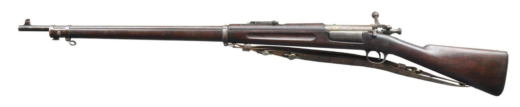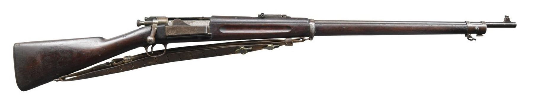 MILITARY RIFLE. Cal. 30-40 Krag. S# 177816. Bbl. 30". Rifle is equipped w/ Model 1901 ladder rear sight. Blade front sight. Walnut stock & handguard. Stock has crisp boxed "JSA 1899" on left side. Circle script "P" under grip & "M" located ahead of trigger guard. Smooth trap buttplate. Model 1907 military sling marked "K&K" / "1918" / "W.J.D.". UNATTACHED ACCESSORIES: slip on brown leather buttpad. CONDITION: Stock has original finish w/ moderate wear, staining & handling marks throughout. 2 sm. holes on top of comb likely from inventory tag. Sm. crack on left side in front of sideplate. Metal has traces of blue turning gray & patina w/ light wear plus oxidation w/ very fine pitting throughout exposed areas. Very good shiny bore w/ sharp lands. (23-4948/RW). CURIO. $400-600.