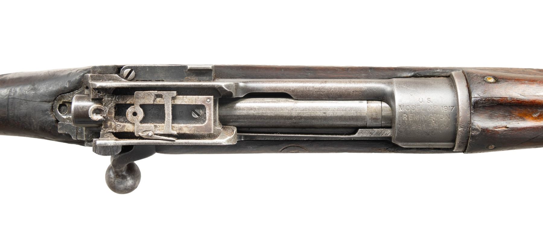 Cal. 30-06. S# 1108322. Bolt is electro-penciled to match. Bbl. 24". Replacement barrel marked behind front sight "SA / flaming bomb / 8-44". Ladder rear sight graduated to 2,850 yards. Rear sight base is Remington type without lightening cuts. Remington marked 1903A3 replacement bolt assembly. Receiver is cut with the oval ejection port used on the Mark I rifle. No other Mark I parts are present. All milled furniture, except stamped buttplate and butt swivel. Late type Model 1903A3 pistol grip walnut stock marked on the left side with faint boxed "C-SAA" indicating overhaul at the San Antonio Arsenal. Stock has boxed "P" proof and "TTI" at end of pistol grip. Stock has been modified on the right side for bolt handle clearance. Walnut Model 1903 handguard. CONDITION: stock set has worn arsenal rework type finish with staining and numerous handling marks throughout. Metal retains 75% of its dark parkerized arsenal rework finish with light wear. Bore has lightly frosted grooves with worn lands. PROVENANCE: Estate Collection of John "Jack" Dhooghe. (25-5526/RW). CURIO. $600-900.