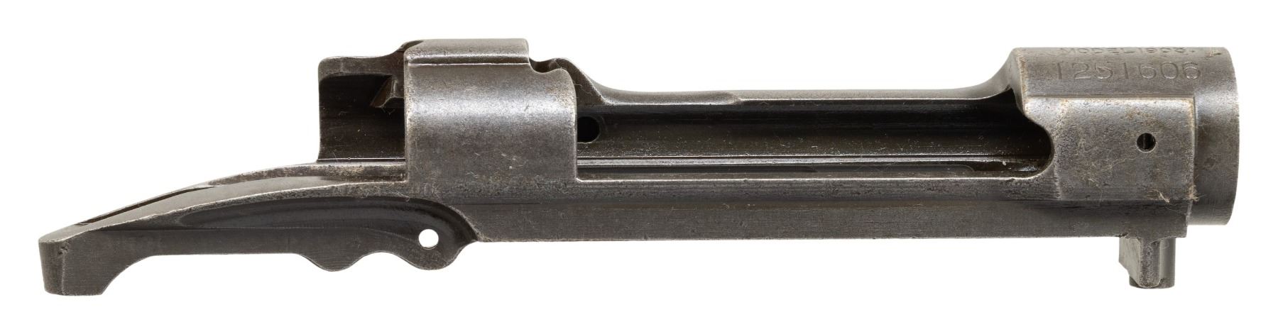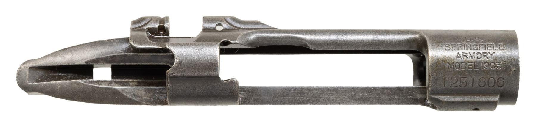 S# 1251606. Receiver manufactured in 1922. Receiver ring marked on top "U.S. SPRINGFIELD / ARMORY / MODEL 1903". Steel lot code "J72" appears at front edge of receiver ring. Receiver contains no additional parts except hold-open pin. CONDITION: receiver has moderate wear turning gray with traces of original blue in protected areas. (25-3003/RW). MODERN. $100-200.