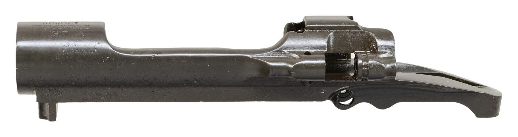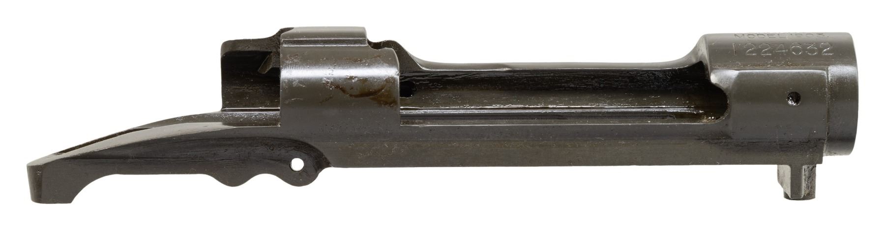 S# 1224632. Receiver manufactured in 1921 and marked "J74" on front edge of receiver ring which would be under the barrel shoulder when assembled to rifle. Receiver marked "U.S. / SPRINGFIELD / ARMORY / MODEL 1903". Receiver contains no additional parts. CONDITION: receiver contains 99% of its arsenal rework parkerized finish over moderate pitting. Pitting is notable on left side above and below wood-line. (25-3005/RW). MODERN. $100-200.