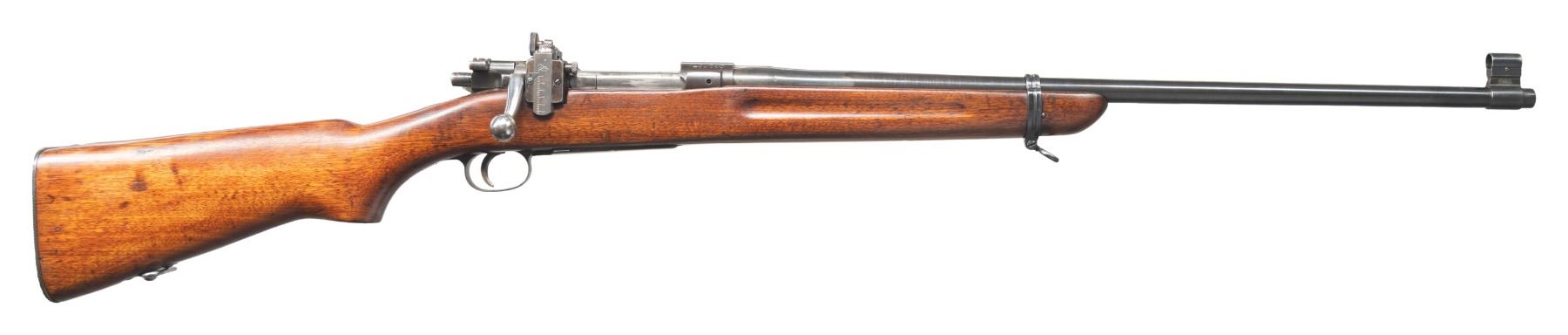RIFLE. Cal. 30-06. S# 1230895. Bbl. 24". Star gauge on muzzle. Barrel is marked behind front sight "SA / flaming bomb / 10-91". Barrel has faint "4932" and "D" markings. The Model 1903 barrel has been turned to change the profile of the original rear sight area, but leaving the spline visible on the top right rear. Lyman 48 rear sight fitted with small knobs and adjustable target type eyepiece. Rear sight assembly numbers match. Slide graduated to 125 points. Unmarked aperture target type front sight fitted in fixed Springfield sight base. Bright bolt with non-matching electro-penciled serial number. Bolt with swept handle is marked on top "W / L / 3". Reversed safety. Headless cocking piece modified to single stage pull. Walnut stock with grasping grooves appears to be from a Springfield M1 22 caliber training rifle. Deep checkered buttplate without trap. Milled rear swivel. Swivel recess has large repaired chip. Barrel band with sling swivel is NRA sporter type. Milled trigger guard. CONDITION: stock has as arsenal rework finish with slight loss of wood in inletted areas and softening of edges. Metalwork has a professional type lightly worn reblue. Finish on barrel and chamber area has notable thin and cold blue chamber areas. Bore is shiny, but lands are worn from extensive careful use. (25-2833/RW). MODERN. $300-450.