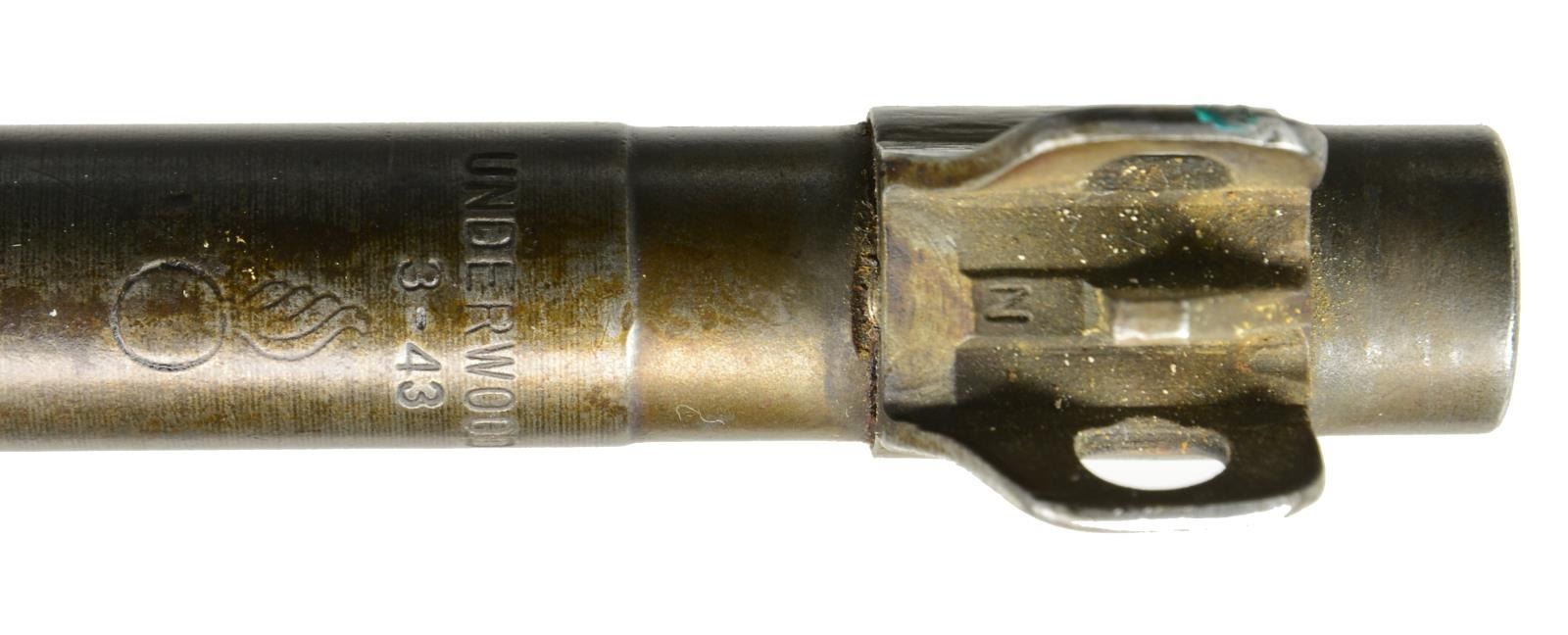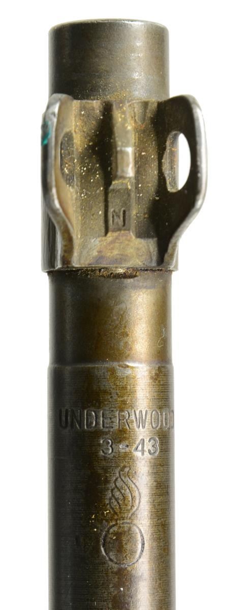Cal. 30 Carb. S# 1381398. Bbl. 18", marked behind front sight w/ “UNDERWOOD 3-43” w/ flaming bomb & “P” proof. Stamped adj. aperture rear sight. Blade front sight w/ protective ears marked “N”. Bbl. band w/ bayonet lug marked “SI”. Straight cut slide w/ indistinct circular marking. Flat bolt marked “SC”. Milled trigger housing marked “INLAND”. Rotary safety. Mag. catch marked “W.I.”. Flat hammer marked “W”. Low wood oval cut buttstock & 4 rivet handguard. Buttstock marked on left side w/ faint boxed “AA” & additionally w/ “AI”. Marked underneath pistol grip w/ 2 “P”s. CONDITION: stock set has arsenal rework type finish w/ light wear & scattered handling marks. Notable sm. chip at right side on belly. Metal has 75% original parkerized finish w/ thinning & light wear. Very good, shiny bore. (20-2219/RW). CURIO. $700-900.