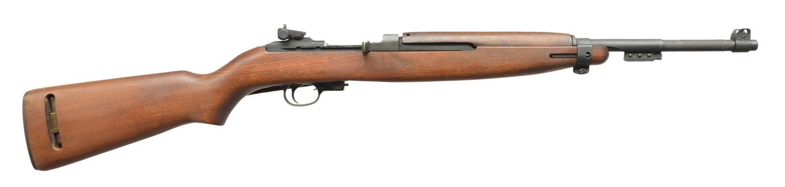 Cal. 30 Carb. S# 4625310. Bbl. 18", marked behind front sight "ROCK-OLA". Bbl. band w/ bayonet lug marked "EM-Q". Adjustable stamped rear sight. Blade front sight w/ protective ears. Flat bolt marked "W". Straight cut slide marked "W". Milled trigger housing marked "SG". Rotary safety. Mag. release has extension for 30 rd. mags. Flat cut bolt marked "HI". Oval cut M-2 style stock. Marked on left side in cheek area w/ boxed "G.H.D.". Stock marked on left side behind bbl. band "S.A.". Marking is covered by handguard when rifle is assembled. Green web sling. Marked on end of pistol grip w/ "(flaming bomb)" & has faint crossed cannons under forend ahead of mag. well. 2 Rivet handguard marked "P-U". MAGS: none. CONDITION: stock has very nice appearance w/ scattered sm. handling marks & sm. filled area on right side of forend. Handguard has notably darker appearance than buttstock. Metal has arsenal rework parkerization w/ very light wear. Very good shiny bore. (21-953/RW). CURIO. $700-1,100.