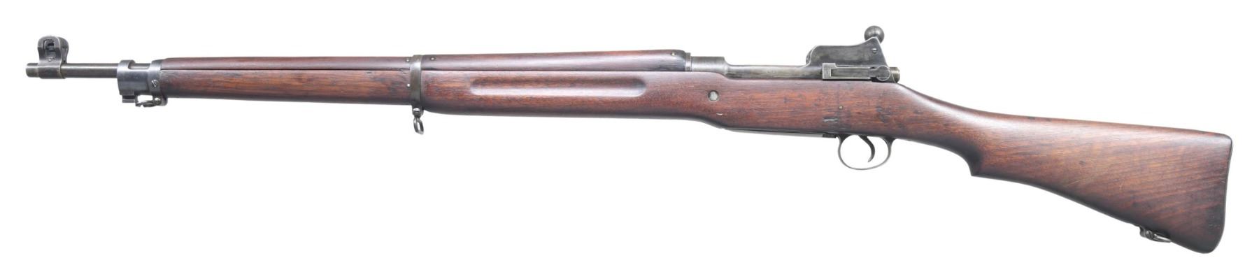 RIFLE. Cal. 30-06. S# 1315510. Bbl. 26". Marked behind front sight "E / flaming bomb / 11-18". Ladder rear sight graduated to 1,600 yards. Blade front sight w/ protective ears. All visible parts markings are "E" except the stock has "R" in the bolt handle notch & an "R" over-stamped w/ an "M" at the forend tip. Bolt handle is marked w/ "flaming bomb" & "Z" on top. Walnut stock set. Smooth trap buttplate. CONDITION: stock set has arsenal rework finish w/ slight loss of wood in inletted areas & softening of edges. Worn metal retains traces of its original blue finish turning gray. Very good shiny bore. (25-3862/RW). CURIO. $350-500.